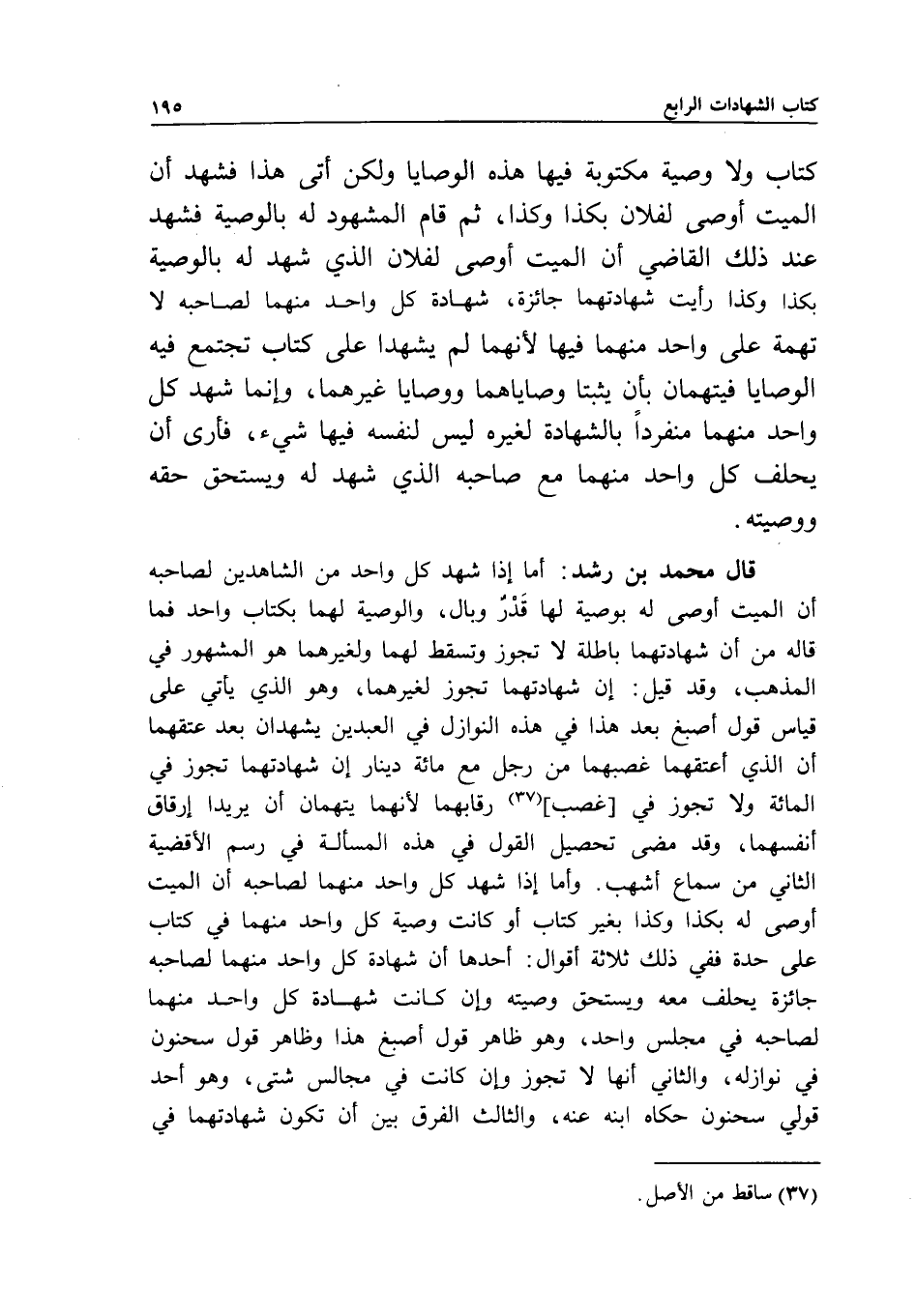 قال محمد بن رشد: أما إذا شهد كل واحد من الشاهدين لصاحبه أن الميت أوصى له بوصية لها قدر وبال، والوصية لهما بكتاب واحد، فما قاله من أن شهادتهما باطلة لا تجوز وتسقط لهما ولغيرهما هو المشهور في المذهب، وقد قيل: إن شهادتهما تجوز لغيرهما، وهو الذي يأتي على قياس قول أصبغ بعد هذا في هذه النوازل في العبدين، يشهدان بعد عتقهما أن الذي أعتقهما غصبهما من رجل مع مائة دينار إن شهادتهما تجوز في المائة، ولا تجوز في غصب رقابهما؛ لأنهما يتهمان أن يريدا إرقاق أنفسهما، وقد مضى تحصيل القول في هذه المسألة، في رسم الأقضية الثاني من سماع أشهب.