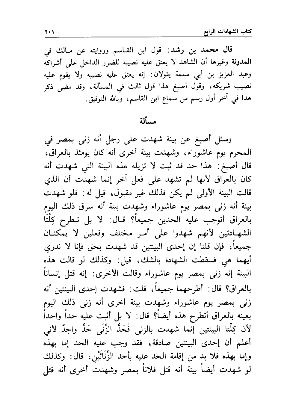 مسألة وسئل أصبغ عن بينة شهدت على رجل أنه زنى بمصر في المحرم يوم عاشوراء، وشهدت بينة أخرى أنه كان يومئذ بالعراق، قال أصبغ: هذا حد قد ثبت لا تزيله هذه البينة التي شهدت أنه كان بالعراق؛ لأنها لم تشهد على فعل آخر، إنما شهدت أن الذي قالت البينة الأولى لم يكن، فذلك غير مقبول، قيل له: فلو شهدت بينة أنه زنى بمصر يوم عاشوراء، وشهدت بينة أنه سرق ذلك اليوم بالعراق، أتوجب عليه الحدين جميعا؟ قال: لا، بل تطرح كلتا الشهادتين؛ لأنهم شهدوا على أمر مختلف وفعلين لا يمكنان جميعا، فإن قلنا: إن إحدى البينتين قد شهدت بحق، فإنا لا ندري أيهما هي، فسقطت الشهادة بالشك، قيل: وكذلك لو قالت هذه البينة: إنه زنى بمصر يوم عاشوراء، وقالت الأخرى: إنه قتل إنسانا بالعراق؟ قال: أطرحهما جميعا، قلت: فشهدت إحدى البينتين أنه زنى بمصر يوم عاشوراء، وشهدت بينة أخرى أنه زنى ذلك اليوم بعينه بالعراق، أتطرح هذه أيضا؟ قال: لا، بل أثبت عليه حدا واحدا؛ لأن كلتا البينتين إنما شهدت بالزنى، فحد الزنى حد واحد؛ لأني أعلم أن إحدى البينتين صادقة، فقد وجب عليه الحد إما بهذه وإما بهذه؛ فلا بد من إقامة الحد عليه بأحد الزنائين، قال: وكذلك لو شهدت أيضا بينة أنه قتل فلانا بمصر، وشهدت أخرى أنه قتل