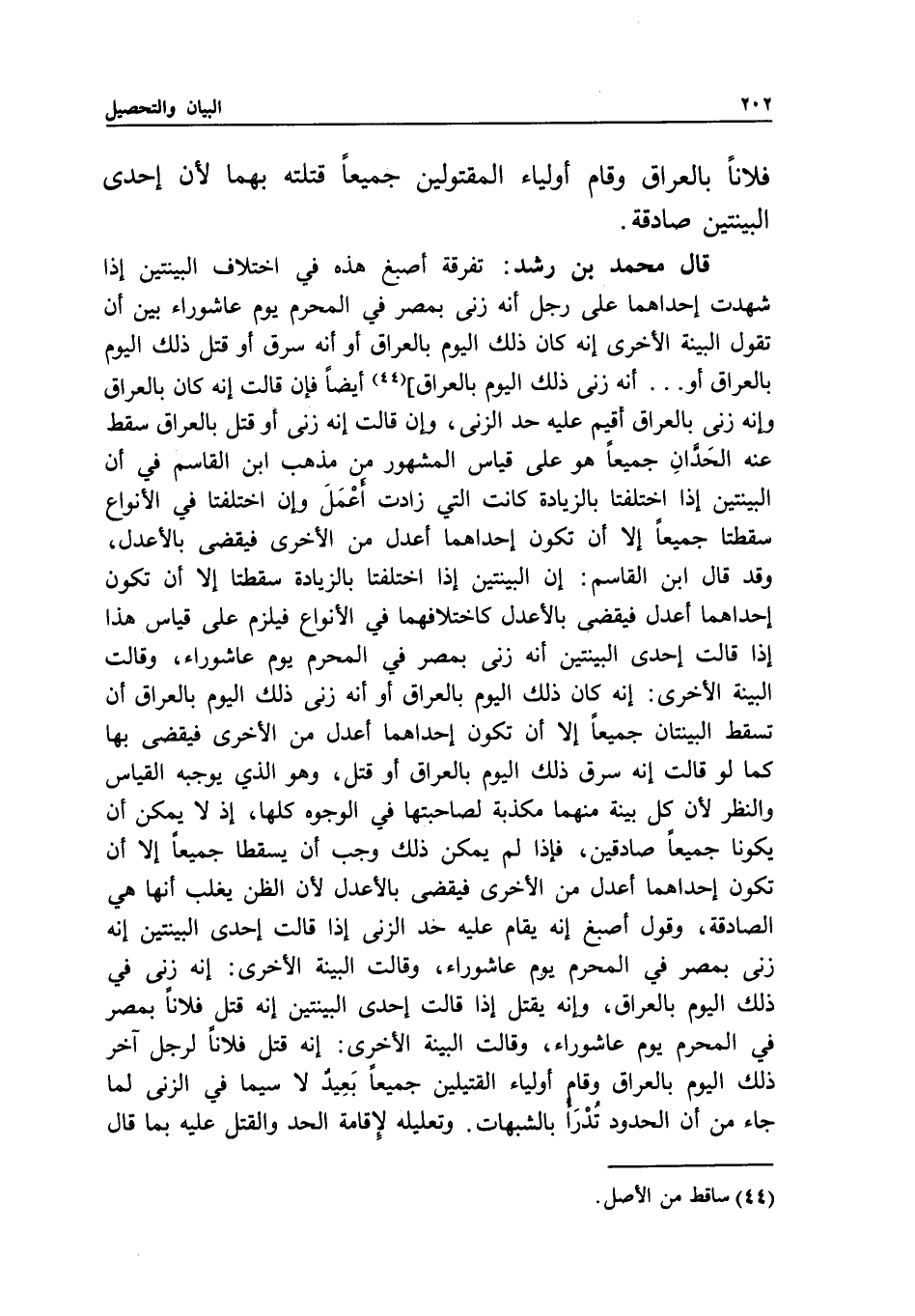 قال محمد بن رشد: تفرقة أصبغ هذه في اختلاف البينتين، إذا شهدت إحداهما على رجل أنه زنى بمصر في المحرم يوم عاشوراء، بين أن تقول البينة الأخرى: إنه كان ذلك اليوم بالعراق، أو إنه سرق أو قتل ذلك اليوم بالعراق، أو. . . إنه زنى ذلك اليوم بالعراق، أيضا فإن قالت: إنه كان بالعراق، وإنه زنى بالعراق؛ أقيم عليه حد الزنى، وإن قالت: إنه زنى أو قتل بالعراق، سقط عنه الحدان جميعا، هو على قياس المشهور من مذهب ابن القاسم في أن البينتين إذا اختلفتا بالزيادة كانت التي زادت أعمل، وإن اختلفتا في الأنواع سقطتا جميعا، إلا أن تكون إحداهما أعدل من الأخرى، فيقضى بالأعدل، وقد قال ابن القاسم: إن البينتين إذا اختلفتا بالزيادة سقطتا، إلا أن تكون إحداهما أعدل؛ فيقضى بالأعدل كاختلافهما في الأنواع، فيلزم على قياس هذا إذا قالت إحدى البينتين: إنه زنى بمصر في المحرم يوم عاشوراء، وقالت البينة الأخرى: إنه كان ذلك اليوم بالعراق، أو إنه زنى ذلك اليوم بالعراق؛ أن تسقط البينتان جميعا، إلا أن تكون إحداهما أعدل من الأخرى، فيقضى بها، كما لو قالت: إنه سرق ذلك اليوم بالعراق أو قتل، وهو الذي يوجبه القياس والنظر؛ لأن كل بينة منهما مكذبة لصاحبتها في الوجوه كلها؛ إذ لا يمكن أن يكونا جميعا صادقين، فإذا لم يمكن ذلك وجب أن يسقطا جميعا، إلا أن تكون إحداهما أعدل من الأخرى، فيقضى بالأعدل؛ لأن الظن يغلب أنها هي الصادقة، وقول أصبغ: إنه يقام عليه حد الزنى إذا قالت إحدى البينتين: إنه زنى بمصر في المحرم يوم عاشوراء، وقالت البينة الأخرى: إنه زنى في ذلك اليوم بالعراق، وإنه يقتل إذا قالت إحدى البينتين: إنه قتل فلانا بمصر في المحرم يوم عاشوراء، وقالت البينة الأخرى: إنه قتل فلانا لرجل آخر ذلك اليوم بالعراق، وقام أولياء القتيلين جميعا بعيد، لا سيما في الزنى؛ لما جاء من أن الحدود تدرأ بالشبهات.