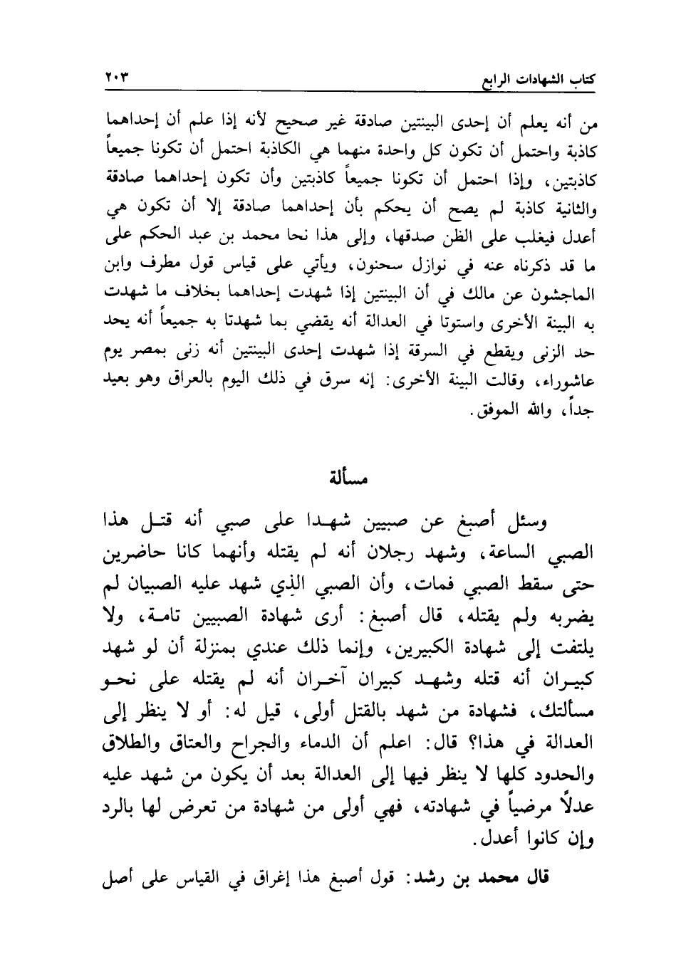مسألة وسئل أصبغ عن صبيين شهدا على صبي أنه قتل هذا الصبي الساعة، وشهد رجلان أنه لم يقتله، وأنهما كانا حاضرين حتى سقط الصبي فمات، وأن الصبي الذي شهد عليه الصبيان لم يضربه ولم يقتله، قال أصبغ: أرى شهادة الصبيين تامة، ولا يلتفت إلى شهادة الكبيرين، وإنما ذلك عندي بمنزلة أن لو شهد كبيران أنه قتله، وشهد كبيران آخران أنه لم يقتله على نحو مسألتك، فشهادة من شهد بالقتل أولى، قيل له: أو لا ينظر إلى العدالة في هذا؟ قال: اعلم أن الدماء والجراح والعتاق والطلاق والحدود، كلها لا ينظر فيها إلى العدالة بعد أن يكون من شهد عليه عدلا مرضيا في شهادته، فهي أولى من شهادة من تعرض لها بالرد، وإن كانوا أعدل.