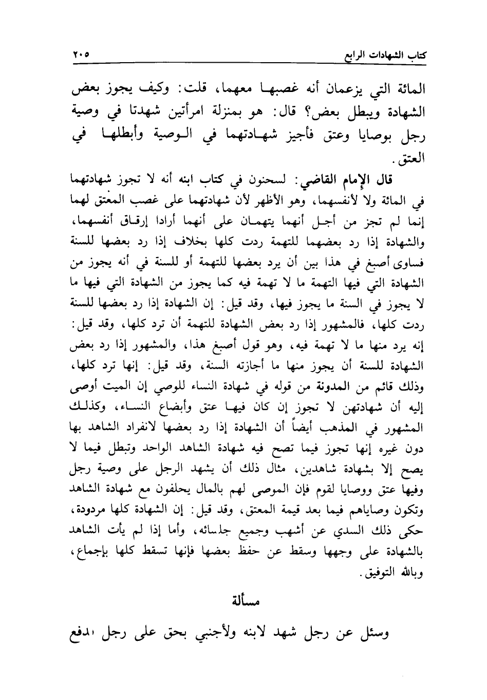 المائة التي يزعمان أنه غصبها معهما، قلت: وكيف يجوز بعض الشهادة ويبطل بعض؟ قال: هو بمنزلة امرأتين شهدتا في وصية رجل بوصايا وعتق، فأجيز شهادتهما في الوصية، وأبطلها في العتق.