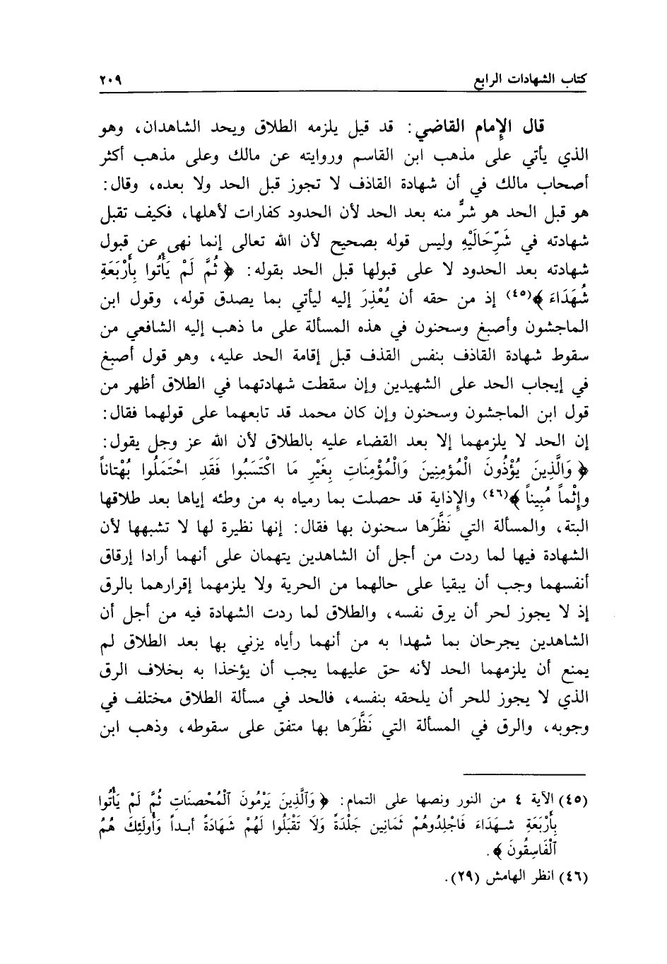قال الإمام القاضي: قد قيل: يلزمه الطلاق ويحد الشاهدان، وهو الذي يأتي على مذهب ابن القاسم وروايته عن مالك، وعلى مذهب أكثر أصحاب مالك، في أن شهادة القاذف لا تجوز قبل الحد ولا بعده، وقال: هو قبل الحد هو شر منه بعد الحد؛ لأن الحدود كفارات لأهلها، فكيف تقبل شهادته في شر حاليه، وليس قوله بصحيح؛ لأن الله تعالى إنما نهى عن قبول شهادته بعد الحدود، لا على قبولها قبل الحد بقوله: {ثُمَّ لَمْ يَأْتُوا بِأَرْبَعَةِ شُهَدَاءَ} [النور: 4] ؛ إذ من حقه أن يعذر إليه ليأتي بما يصدق قوله، وقول ابن الماجشون وأصبغ وسحنون في هذه المسألة على ما ذهب إليه الشافعي من سقوط شهادة القاذف بنفس القذف قبل إقامة الحد عليه، وهو قول أصبغ في إيجاب الحد على الشهيدين، وإن سقطت شهادتهما في الطلاق أظهر من قول ابن الماجشون وسحنون، وإن كان محمد قد تابعهما على قولهما فقال: إن الحد لا يلزمهما إلا بعد القضاء عليه بالطلاق؛ لأن الله عز وجل يقول: {وَالَّذِينَ يُؤْذُونَ الْمُؤْمِنِينَ وَالْمُؤْمِنَاتِ بِغَيْرِ مَا اكْتَسَبُوا فَقَدِ احْتَمَلُوا بُهْتَانًا وَإِثْمًا مُبِينًا} [الأحزاب: 58] .