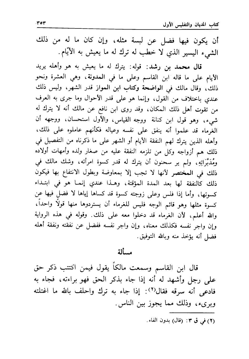 قال محمد بن رشد: قوله: يترك له ما يعيش به هو وأهله يريد الأيام على ما قاله ابن القاسم وعلى ما في المدونة، وهي العشرة ونحو ذلك، وقال مالك في الواضحة وكتاب ابن المواز قدر الشهر، وليس ذلك عندي باختلاف من القول، وإنما هو على قدر الأحوال وما جرى به العرف من تقوت أهل ذلك المكان، وقد روى ابن نافع عن مالك أنه لا يترك له شيء، وهو قول ابن كنانة ووجه القياس، والأول استحسان، ووجهه أن الغرماء قد علموا أنه ينفق على نفسه وعياله فكأنهم عاملوه على ذلك، وأهله الذين يترك لهم النفقة الأيام أو الشهر على ما ذكرناه من التفصيل في ذلك هم أزواجه وكل من تلزمه النفقة عليه من صغار ولده وأمهات أولاده ومدبراته، ولم ير سحنون أن يترك له قدر كسوة امرأته، وشك مالك في ذلك في المختصر لأنها لا تجب إلا بمعاوضة وبطول الانتفاع بها فيكون ذلك كالنفقة لها بعد المدة المؤقتة، وهذا عندي إنما هو في ابتداء كسوتها، وأما إذا فلس وعلى زوجته كسوة قد كساها إياها لا فضل فيها عن كسوة مثلها وهو قائم الوجه فليس للغرماء أن يستردوها منها قولا واحدا، والله أعلم، لأن الغرماء قد دخلوا معه على ذلك. وقوله في هذه الرواية وإن واجر نفسه فكذلك معناه، وإن واجر نفسه ففضل عن نفقته ونفقة أهله فضل أنه يؤخذ منه وبالله التوفيق.