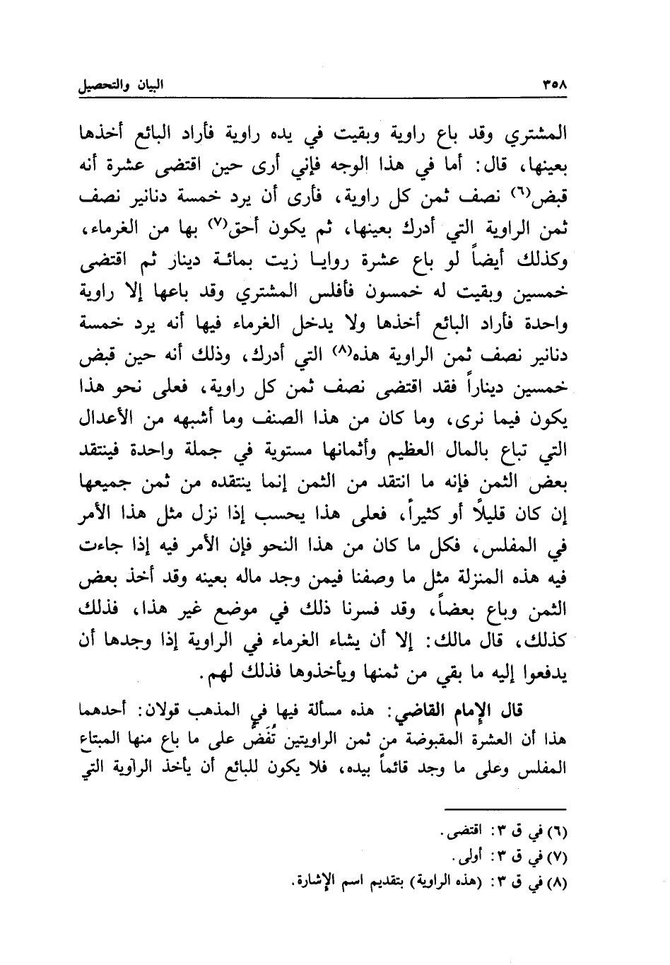 قال الإمام القاضي: هذه مسألة فيها في المذهب قولان: أحدهما هذا أن العشرة المقبوضة من ثمن الراويتين تفض على ما باع منها المبتاع المفلس وعلى ما وجد قائما بيده، فلا يكون للبائع أن يأخذ الراوية التي