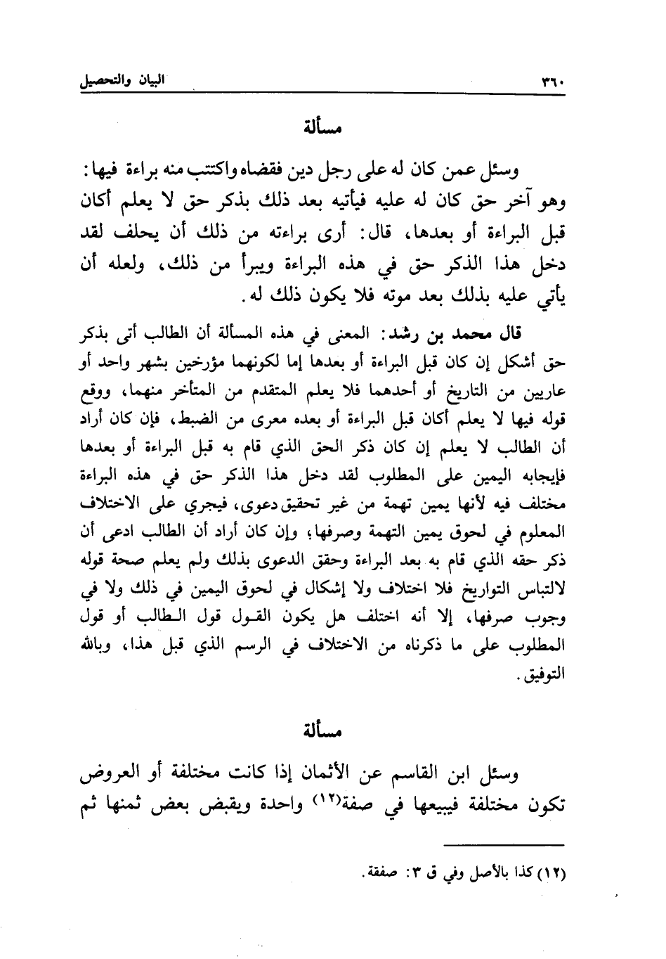 قال محمد بن رشد: المعنى في هذه المسألة أن الطالب أتى بذكر حق أشكل إن كان قبل البراءة أو بعدها إما لكونهما مؤرخين بشهر واحد أو عاريين من التاريخ أو أحدهما فلا يعلم المتقدم من المتأخر منهما، ووقع قوله فيها لا يعلم أكان قبل البراءة أو بعده معرى من الضبط، فإن كان أراد أن الطالب لا يعلم إن كان ذكر الحق الذي قام به قبل البراءة أو بعدها فإيجابه اليمين على المطلوب لقد دخل هذا الذكر حق في هذه البراءة مختلف فيه لأنها يمين تهمة من غير تحقيق دعوى، فيجري على الاختلاف المعلوم في لحوق يمين التهمة وصرفها؛ وإن كان أراد أن الطالب ادعى أن ذكر حقه الذي قام به بعد البراءة وحقق الدعوى بذلك ولم يعلم صحة قوله لالتباس التواريخ فلا اختلاف ولا إشكال في لحوق اليمين في ذلك ولا في وجوب صرفها، إلا أنه اختلف هل يكون القول قول الطالب أو قول المطلوب على ما ذكرناه من الاختلاف في الرسم الذي قبل هذا، وبالله التوفيق.