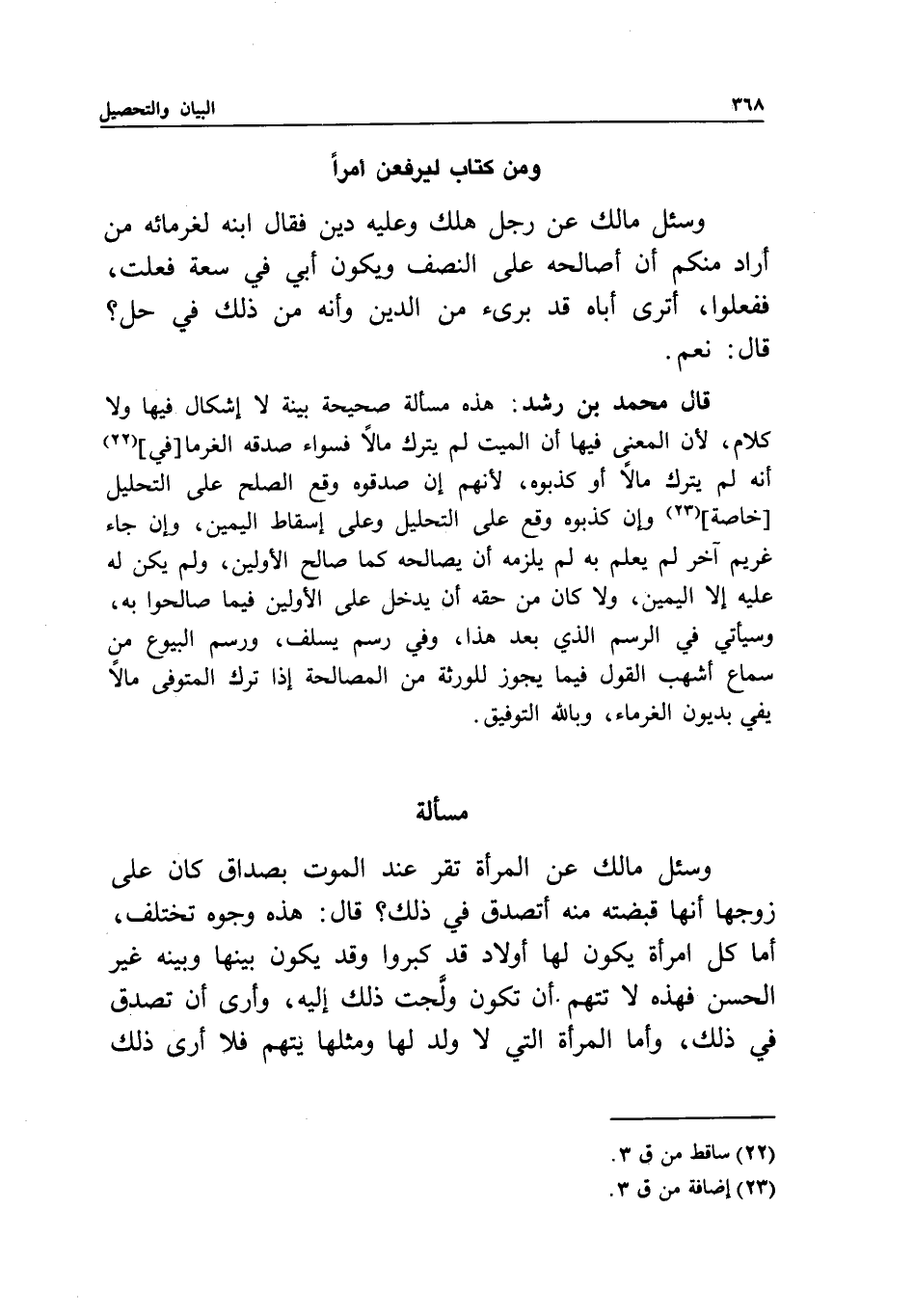ومن كتاب ليرفعن أمرا وسئل مالك عن رجل هلك وعليه دين فقال ابنه لغرمائه: من أراد منكم أن أصالحه على النصف ويكون أبي في سعة فعلت، ففعلوا، أترى أباه قد برئ من الدين وأنه من ذلك في حل؟ قال: نعم.