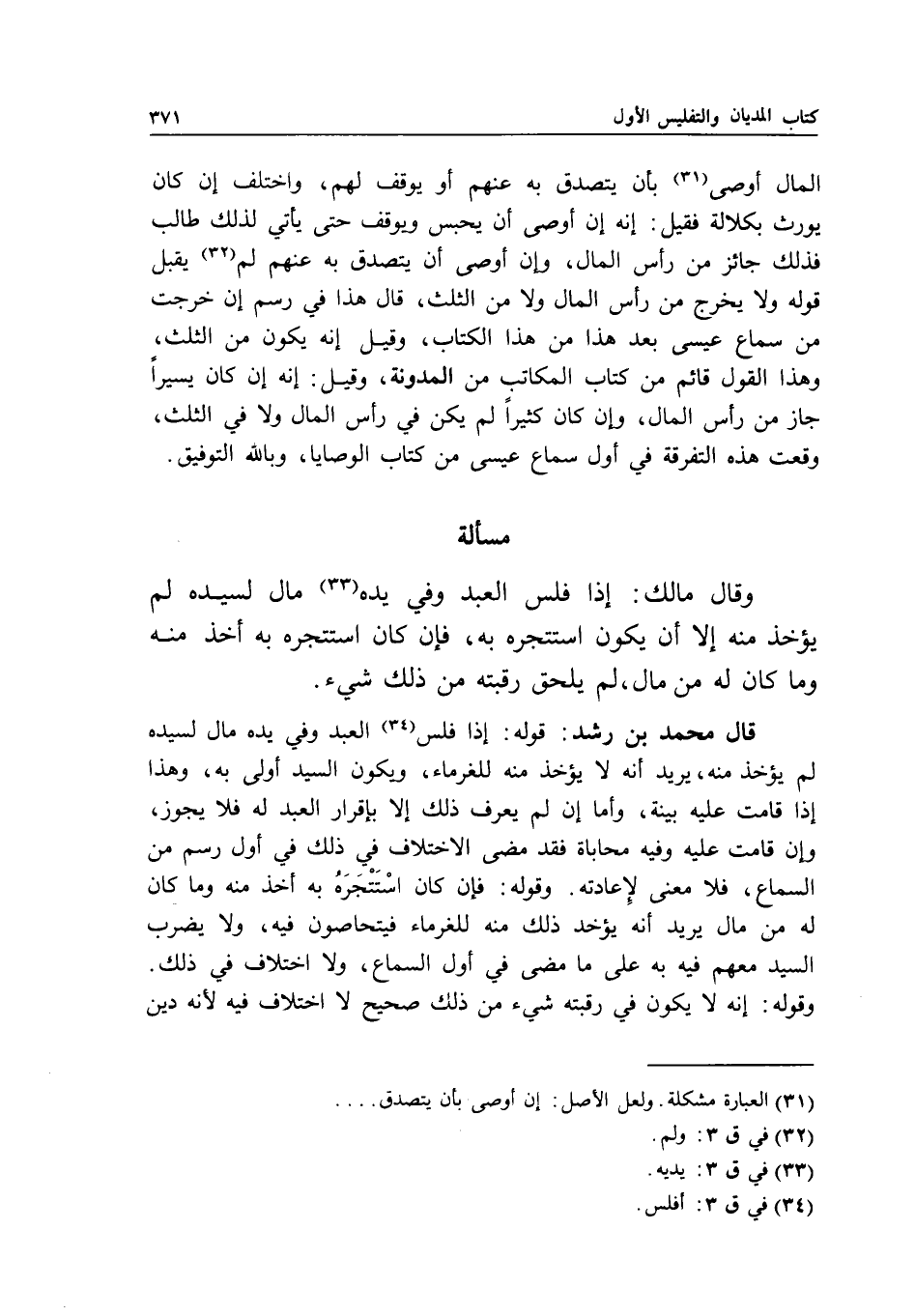 المال أوصى بأن يتصدق به عنهم أو يوقف لهم، واختلف إن كان يورث بكلالة فقيل: إنه إن أوصى أن يحبس ويوقف حتى يأتي لذلك طالب فذلك جائز من رأس المال، وإن أوصى أن يتصدق به عنهم لم يقبل قوله ولا يخرج من رأس المال ولا من الثلث، قال هذا في رسم إن خرجت من سماع عيسى بعد هذا من هذا الكتاب، وقيل: إنه يكون من الثلث، وهذا القول قائم من كتاب المكاتب من المدونة، وقيل: إنه إن كان يسيرا جاز من رأس المال، وإن كان كثيرا لم يكن في رأس المال ولا في الثلث، وقعت هذه التفرقة في أول سماع عيسى من كتاب الوصايا، وبالله التوفيق.