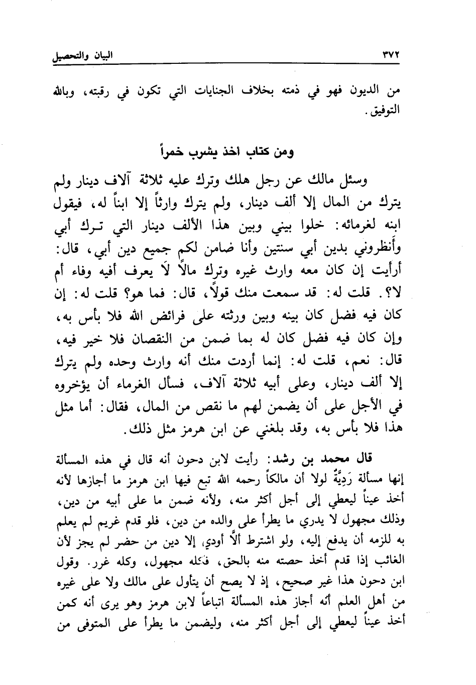ومن كتاب أخذ يشرب خمرا وسئل مالك عن رجل هلك وترك عليه ثلاثة آلاف دينار ولم يترك من المال إلا ألف دينار، ولم يترك وارثا إلا ابنا له، فيقول ابنه لغرمائه: خلوا بيني وبين هذا الألف دينار التي ترك أبي وأنظروني بدين أبي سنتين وأنا ضامن لكم جميع دين أبي، قال: أرأيت إن كان معه وارث غيره وترك مالا لا يعرف أفيه وفاء أم لا؟ . قلت له: قد سمعت منك قولا، قال: فما هو؟ قلت له: إن كان فيه فضل كان بينه وبين ورثته على فرائض الله فلا بأس به، وإن كان فيه فضل كان له بما ضمن من النقصان فلا خير فيه، قال: نعم، قلت له: إنما أردت منك أنه وارث وحده ولم يترك إلا ألف دينار، وعلى أبيه ثلاثة آلاف، فسأل الغرماء أن يؤخروه في الأجل على أن يضمن لهم ما نقص من المال، فقال: أما مثل هذا فلا بأس به، وقد بلغني عن ابن هرمز مثل ذلك.