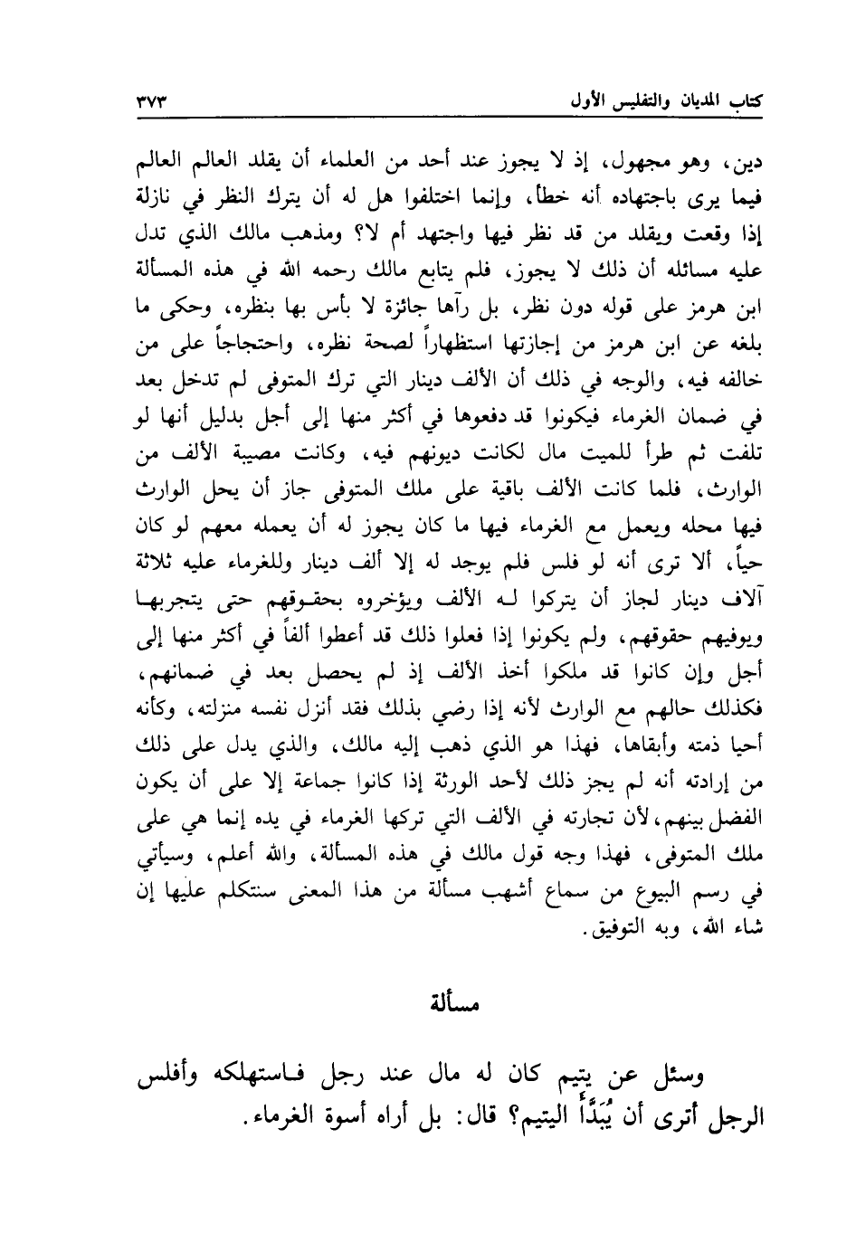 دين، وهو مجهول، إذ لا يجوز عند أحد من العلماء أن يقلد العالم العالم فيما يرى باجتهاده أنه خطأ، وإنما اختلفوا هل له أن يترك النظر في نازلة إذا وقعت ويقلد من قد نظر فيها واجتهد أم لا؟ ومذهب مالك الذي تدل عليه مسائله أن ذلك لا يجوز، فلم يتابع مالك - رَحِمَهُ اللَّهُ - في هذه المسألة ابن هرمز على قوله دون نظر، بل رآها جائزة لا بأس بها بنظره، وحكى ما بلغه عن ابن هرمز من إجازتها استظهارا لصحة نظره، واحتجاجا على من خالفه فيه، والوجه في ذلك أن الألف دينار التي ترك المتوفى لم تدخل بعد في ضمان الغرماء فيكونوا قد دفعوها في أكثر منها إلى أجل بدليل أنها لو تلفت ثم طرأ للميت مال لكانت ديونهم فيه، وكانت مصيبة الألف من الوارث، فلما كانت الألف باقية على ملك المتوفى جاز أن يحل الوارث فيها محله ويعمل مع الغرماء فيها ما كان يجوز له أن يعمله معهم لو كان حيا، ألا ترى أنه لو فلس فلم يوجد له إلا ألف دينار وللغرماء عليه ثلاثة آلاف دينار لجاز أن يتركوا له الألف ويؤخروه بحقوقهم حتى يتجر بها ويوفيهم حقوقهم، ولم يكونوا إذا فعلوا ذلك قد أعطوا ألفا في أكثر منها إلى أجل وإن كانوا قد ملكوا أخذ الألف إذ لم يحصل بعد في ضمانهم، فكذلك حالهم مع الوارث لأنه إذا رضي بذلك فقد أنزل نفسه منزلته، وكأنه أحيا ذمته وأبقاها، فهذا هو الذي ذهب إليه مالك، والذي يدل على ذلك من إرادته أنه لم يجز ذلك لأحد الورثة إذا كانوا جماعة إلا على أن يكون الفضل بينهم، لأن تجارته في الألف التي تركها الغرماء في يده إنما هي على ملك المتوفى، فهذا وجه قول مالك في هذه المسألة، والله أعلم، وسيأتي في رسم البيوع من سماع أشهب مسألة من هذا المعنى سنتكلم عليها إن شاء الله، وبه التوفيق.