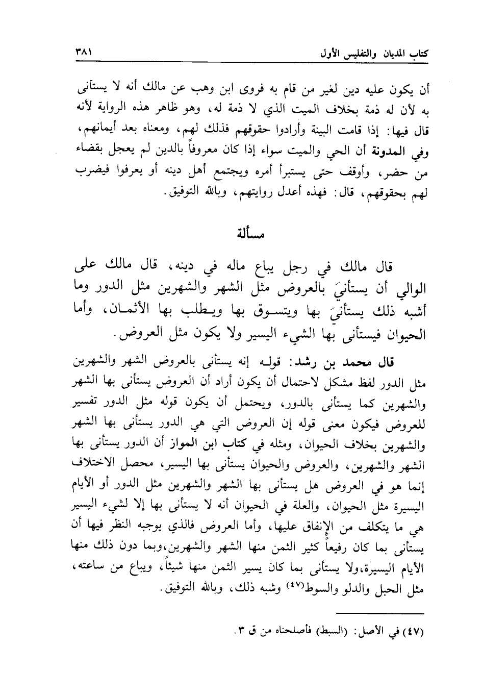 مسألة قال مالك في رجل يباع ماله في دينه، قال مالك: على الوالي أن يستأني بالعروض مثل الشهر والشهرين مثل الدور وما أشبه ذلك يستأني بها ويتسوق بها ويطلب بها الأثمان، وأما الحيوان فيستأنى بها الشيء اليسير ولا يكون مثل العروض.