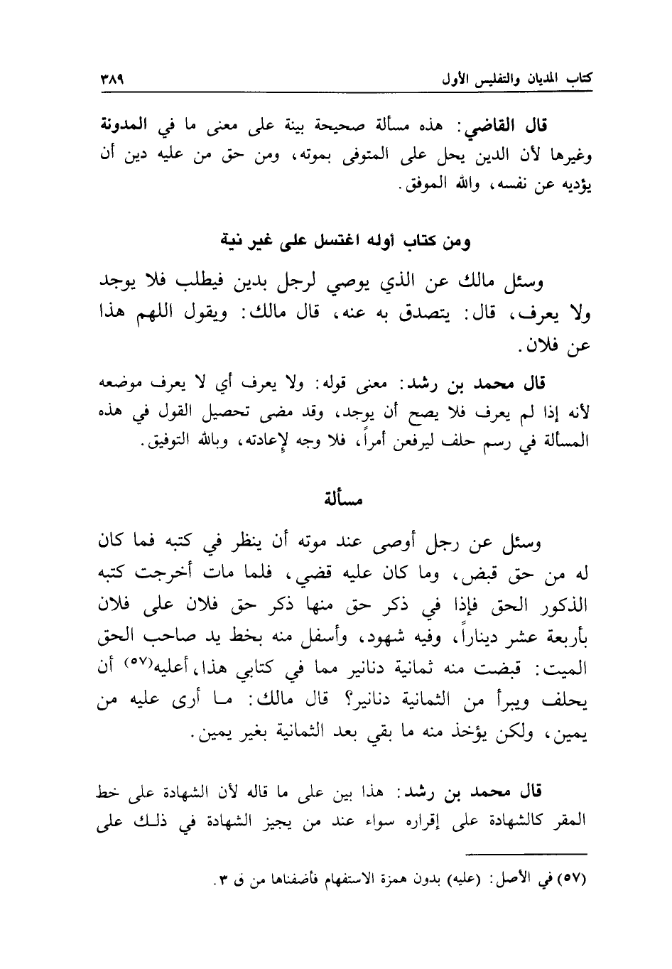 قال القاضي: هذه مسألة صحيحة بينة على معنى ما في المدونة وغيرها لأن الدين يحل على المتوفى بموته، ومن حق من عليه دين أن يؤديه عن نفسه، والله الموفق.