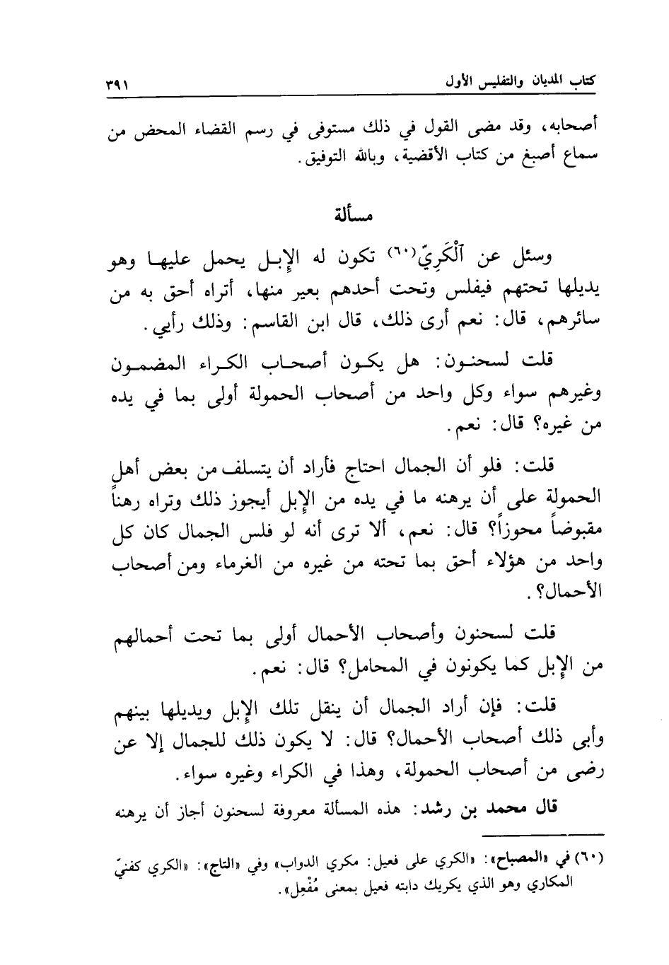 مسألة وسئل عن الكَرِيّ تكون له الإبل يحمل عليها وهو يديلها تحتهم فيفلس وتحت أحدهم بعير منها، أتراه أحق به من سائرهم؟ قال: نعم أرى ذلك، قال ابن القاسم: وذلك رأيي. قلت لسحنون: هل يكون أصحاب الكراء المضمون وغيرهم سواء وكل واحد من أصحاب الحمولة أولى بما في يده من غيره؟ قال: نعم.