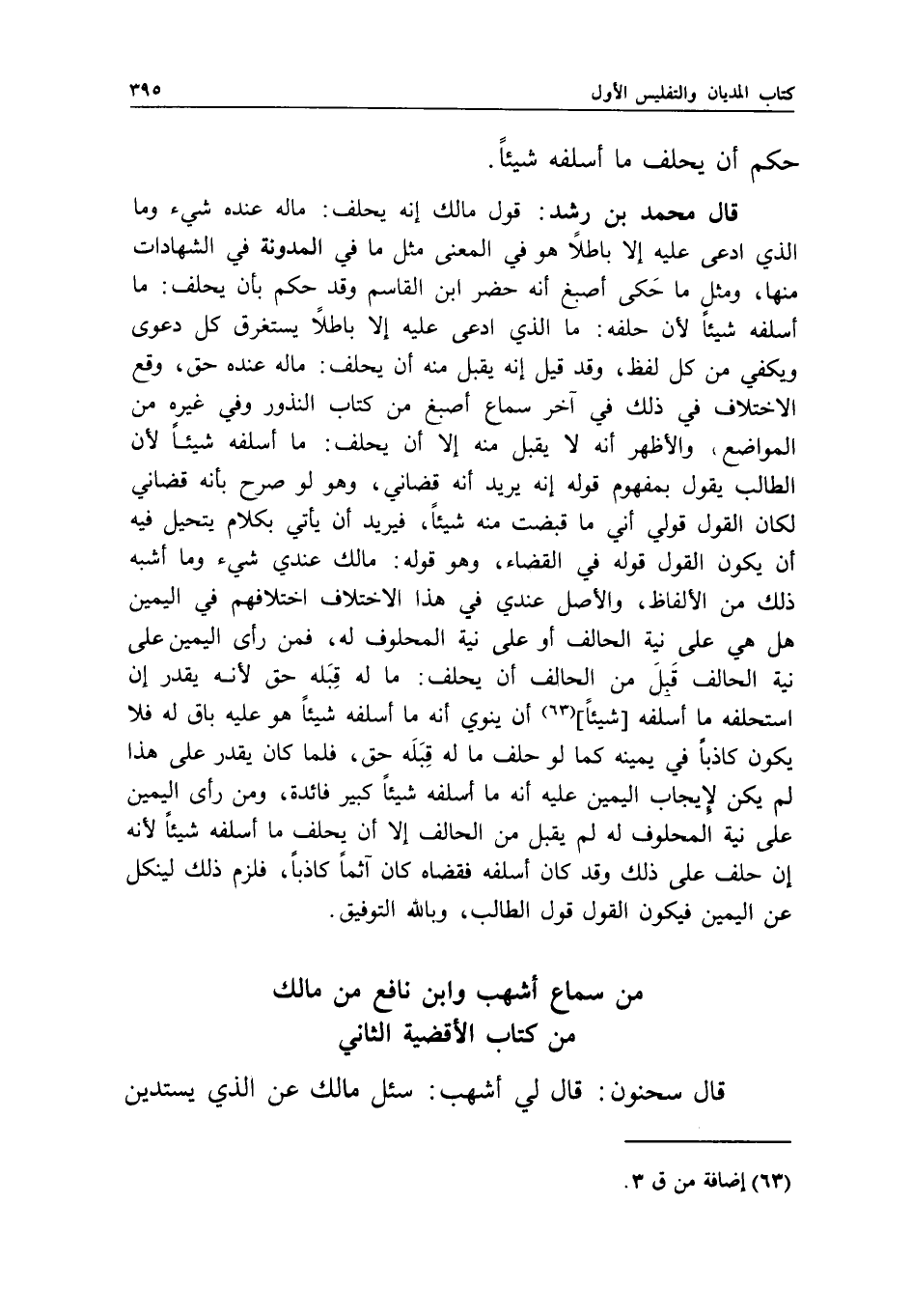 قال سحنون: قال لي أشهب: سئل مالك: عن الذي يستدين
