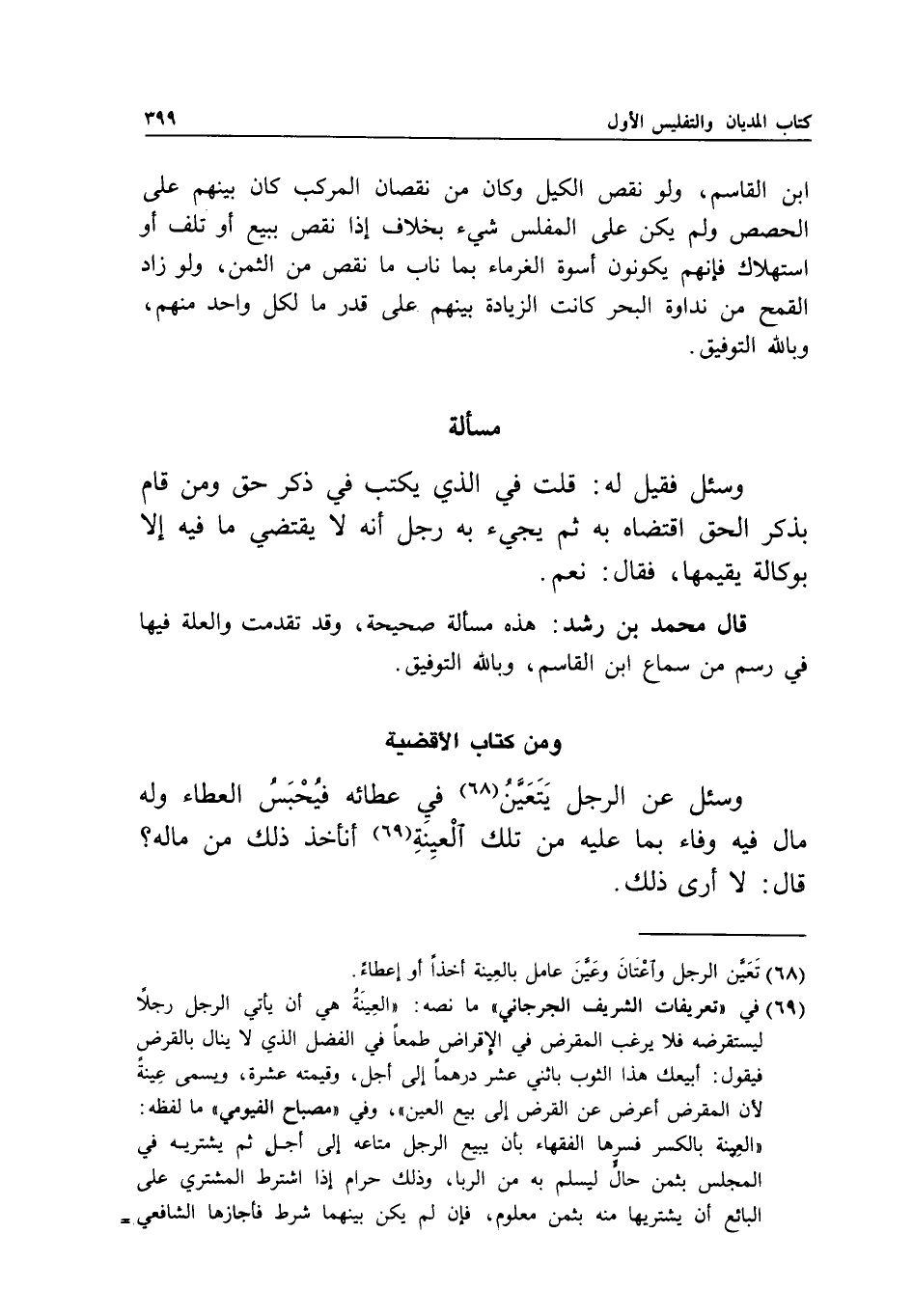 ومن كتاب الأقضية وسئل: عن الرجل يتعين في عطائه فيحبس العطاء وله مال فيه وفاء بما عليه من تلك العينة، أنأخذ ذلك من ماله؟