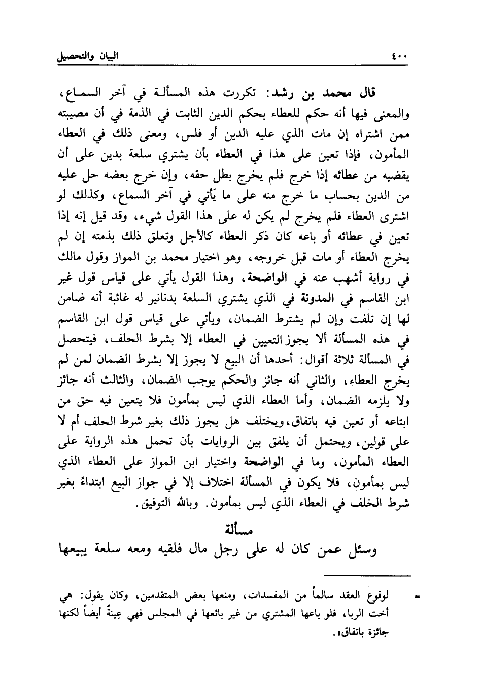 قال محمد بن رشد: تكررت هذه المسألة في آخر السماع، والمعنى فيها أنه حكم للعطاء بحكم الدين الثابث في الذمة في أن مصيبته ممن اشتراه إن مات الذي عليه الدين أو فلس، ومعنى ذلك في العطاء المأمون، فإذا تعين على هذا في العطاء بأن يشتري سلعة بدين على أن يقضيه من عطائه إذا خرج فلم يخرج بطل حقه، وإن خرج بعضه حل عليه من الدين بحساب ما خرج منه على ما يأتي في آخر السماع.