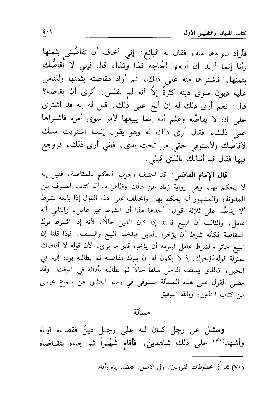 قال الإمام القاضي: قد اختلف وجوب الحكم بالمقاصة، فقيل: إنه لا يحكم بها، وهي رواية زياد عن مالك، وظاهر مسألة كتاب الصرف من المدونة، والمشهور أنه يحكم بها.