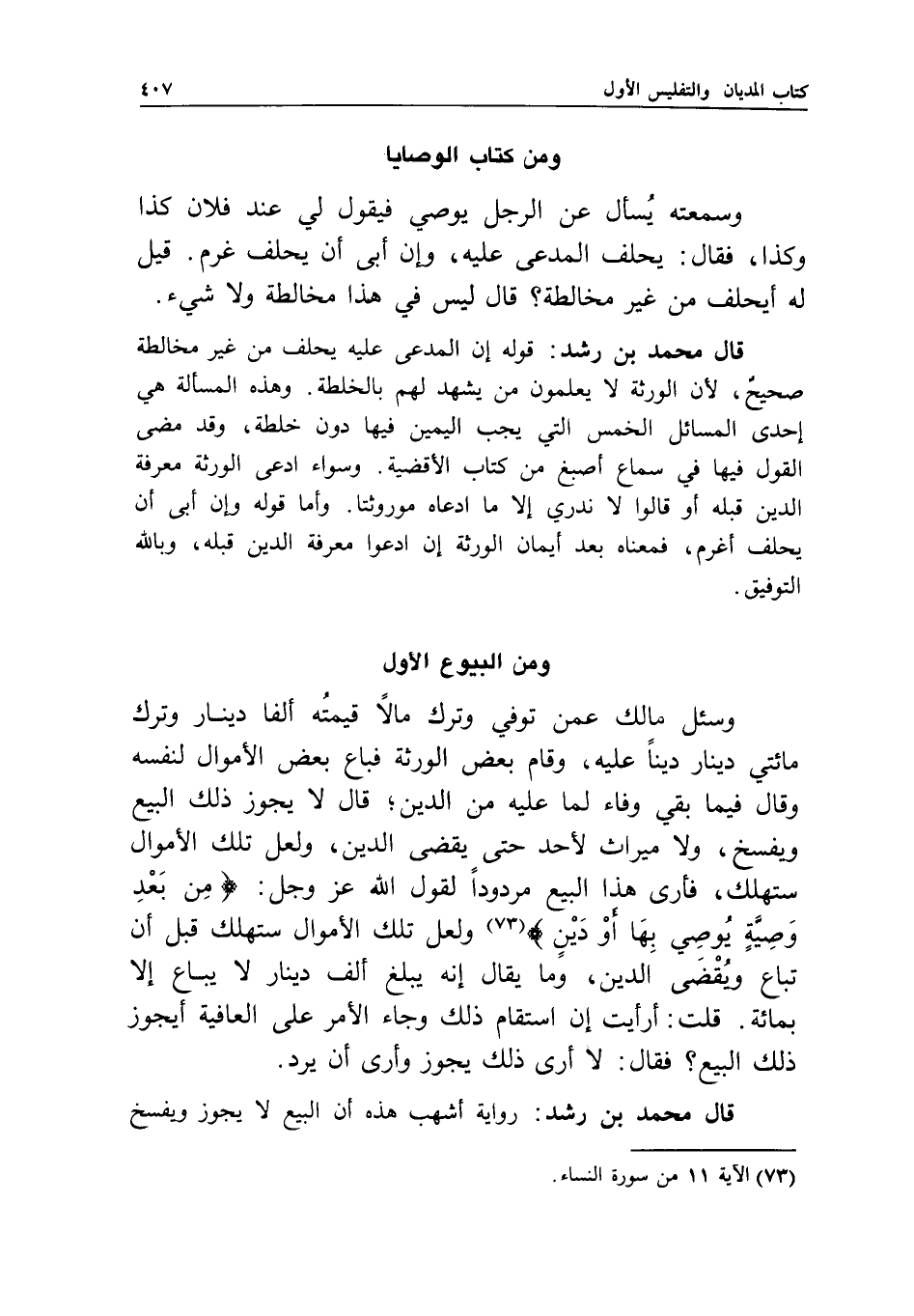 ومن البيوع الأول وسئل مالك: عمن توفي وترك مالا قيمته ألفا دينار وترك مائتي دينار دينا عليه، وقام بعض الورثة فباع بعض الأموال لنفسه وقال فيما بقي وفاء لما عليه من الدين، قال: لا يجوز ذلك البيع ويفسخ، ولا ميراث لأحد حتى يقضى الدين، ولعل تلك الأموال ستهلك، فأرى هذا البيع مردودا لقول الله عز وجل: {مِنْ بَعْدِ وَصِيَّةٍ يُوصِي بِهَا أَوْ دَيْنٍ} [النساء: 11] ولعل تلك الأموال ستهلك قبل أن تباع ويقضى الدين، وما يقال إنه يبلغ ألف دينار لا يباع إلا بمائة.
