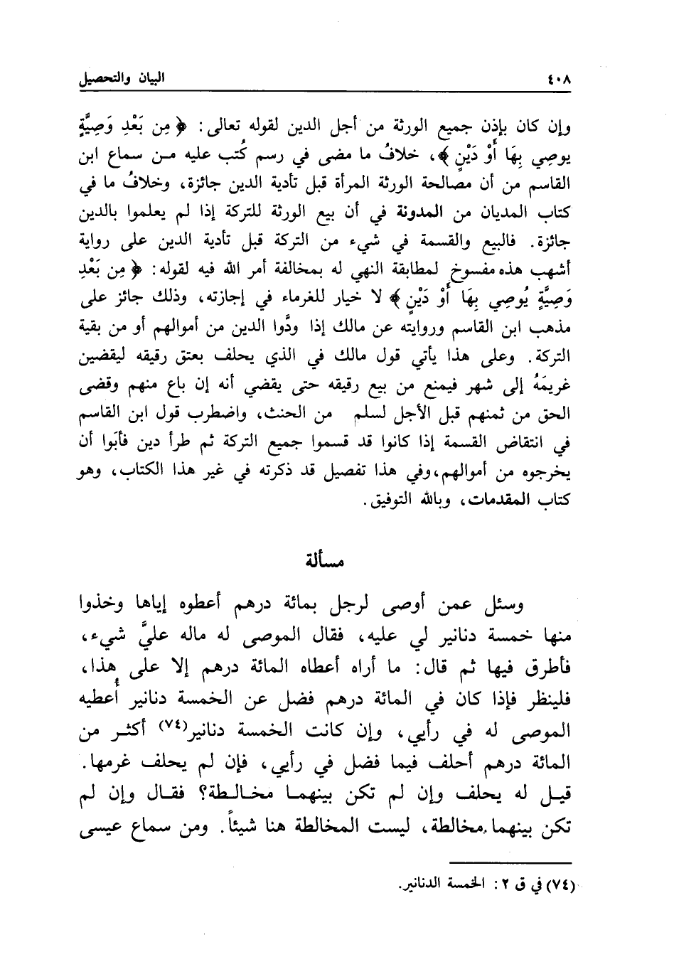 وعلى هذا يأتي قول مالك في الذي يحلف بعتق رقيقه ليقضين غريمه إلى شهر فيمنع من بيع رقيقه حتى يقضي أنه إن باع منهم وقضى الحق من ثمنهم قبل الأجل لسلم من الحنث، واضطرب قول ابن القاسم في انتقاض القسمة إذا كانوا قد قسموا جميع التركة ثم طرأ دين فأبوا أن يخرجوه من أموالهم، وفي هذا تفصيل قد ذكرته في غير هذا الكتاب، وهو كتاب المقدمات، وبالله التوفيق.
