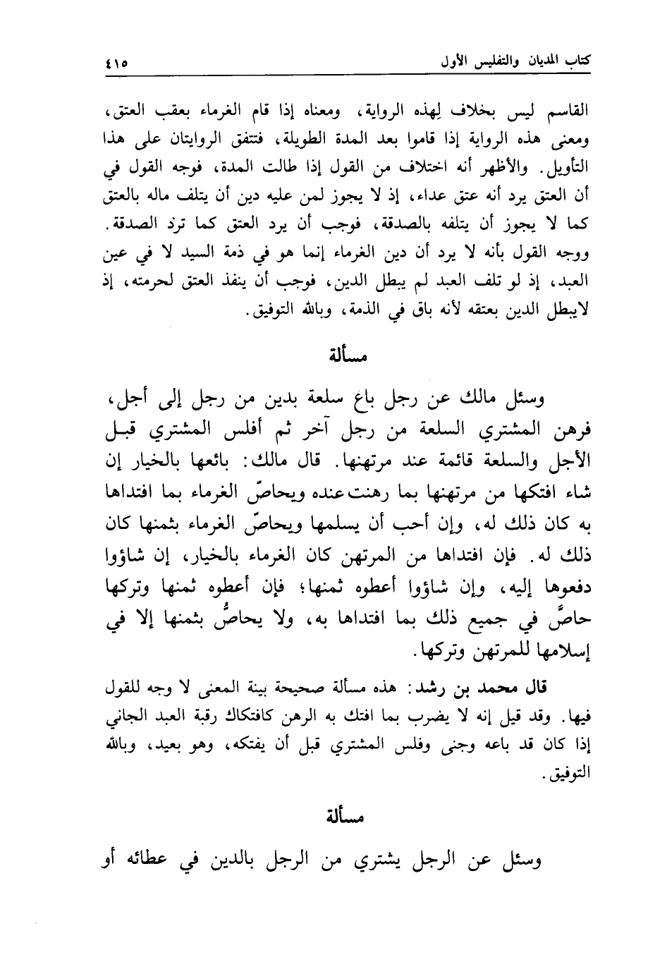 قال محمد بن رشد: هذه مسألة صحيحة بينة المعنى لا وجه للقول فيها.