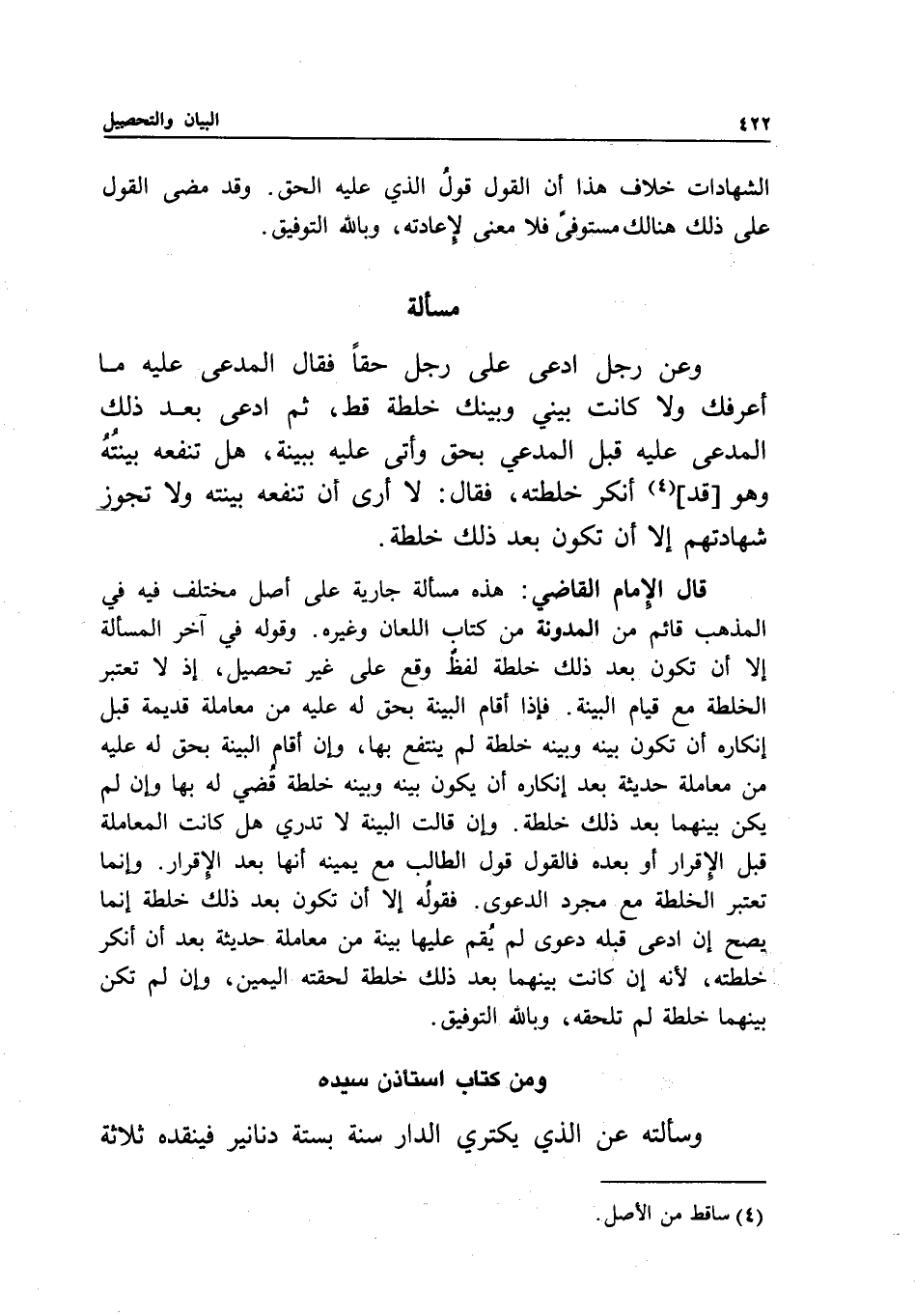 قال الإمام القاضي: هذه مسألة جارية على أصل مختلف فيه في المذهب قائم من المدونة من كتاب اللعان وغيره.