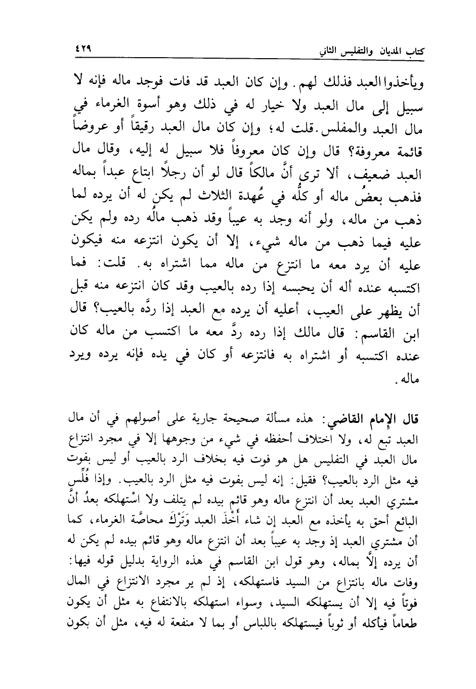 قال الإمام القاضي: هذه مسألة صحيحة جارية على أصولهم في أن مال العبد تبع له، ولا اختلاف أحفظه في شيء من وجوهها إلا في مجرد انتزاع مال العبد في التفليس هل هو فوت فيه بخلاف الرد بالعيب أو ليس بفوت فيه مثل الرد بالعيب؟ فقيل: إنه ليس بفوت فيه مثل الرد بالعيب.