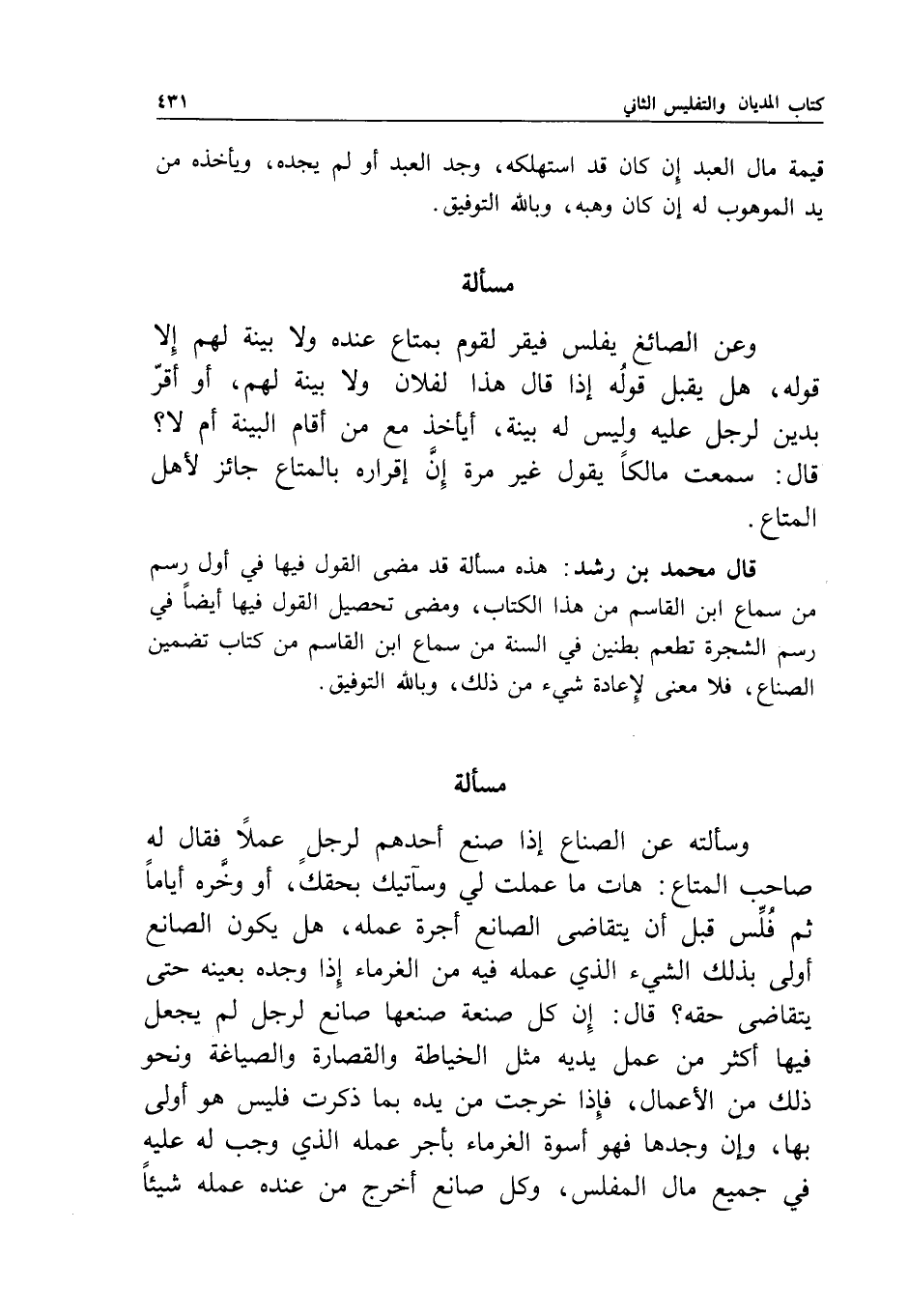 قال محمد بن رشد: هذه مسألة قد مضى القول فيها في أول رسم من سماع ابن القاسم من هذا الكتاب، ومضى تحصيل القول فيها أيضا في رسم الشجرة تطعم بطنين في السنة من سماع ابن القاسم من كتاب تضمين الصناع، فلا معنى لإعادة شيء من ذلك، وبالله التوفيق.