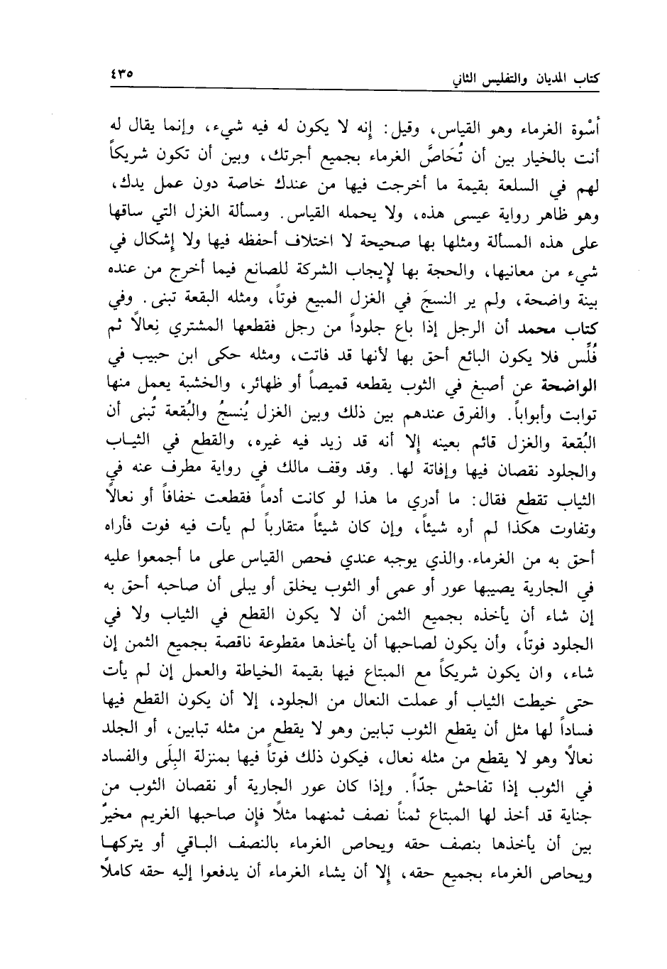 والذي يوجبه عندي فحص القياس على ما أجمعوا عليه في الجارية يصيبها عور أو عمى أو الثوب يخلق أو يبلى أن صاحبه أحق به إن شاء أن يأخذه بجميع الثمن أن لا يكون القطع في الثياب ولا في الجلود فوتا، وأن يكون لصاحبها أن يأخذها مقطوعة ناقصة بجميع الثمن إن شاء، وأن يكون شريكا مع المبتاع فيها بقيمة الخياطة والعمل إن لم يأت حتى خيطت الثياب أو عملت النعال من الجلود، إلا أن يكون القطع فيها فسادا لها مثل أن يقطع الثوب تبابين وهو لا يقطع من مثله تبابين، أو الجلد نعالا وهو لا يقطع من مثله نعال، فيكون ذلك فوتا فيها بمنزلة البلى والفساد في الثوب إذا تفاحش جدا.