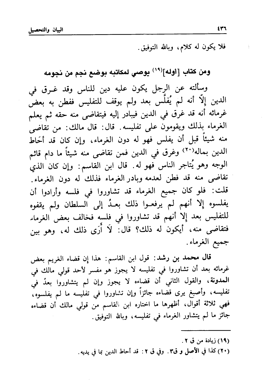 قال محمد بن رشد: قول ابن القاسم هذا: إن قضاء الغريم بعض غرمائه بعد أن تشاوروا في تفليسه لا يجوز - هو مفسر لأحد قولي مالك في المدونة، والقول الثاني: أن قضاءه لا يجوز وإن لم يتشاوروا بعد في تفليسه، وأصبغ يرى قضاءه جائزا وإن تشاوروا في تفليسه ما لم يفلسوه، فهي ثلاثة أقوال، أظهرها ما اختاره ابن القاسم من قولي مالك أن قضاءه جائز ما لم يتشاور الغرماء في تفليسه، وبالله التوفيق.