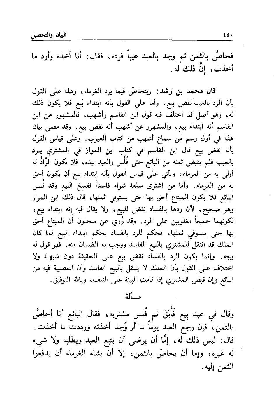 وإنما يكون الرد بالفساد نقض بيع على الحقيقة دون شبهة ولا اختلاف على القول بأن الملك لا ينتقل بالبيع الفاسد وأن المصيبة فيه من البائع وإن قبض المشتري إذا قامت البينة على التلف، وبالله التوفيق.