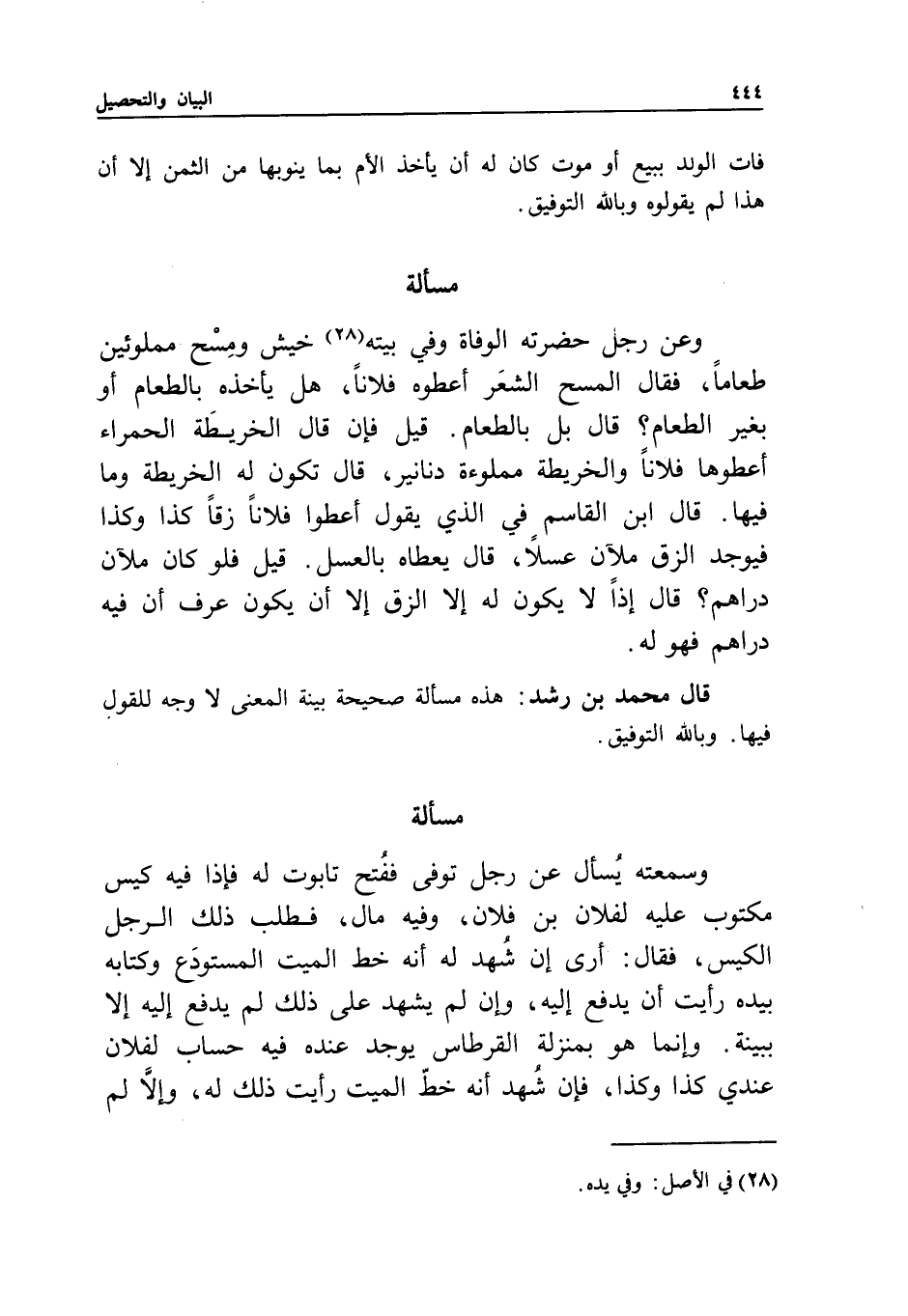 قال محمد بن رشد: هذه مسألة صحيحة بينة المعنى لا وجه للقول فيها. وبالله التوفيق.