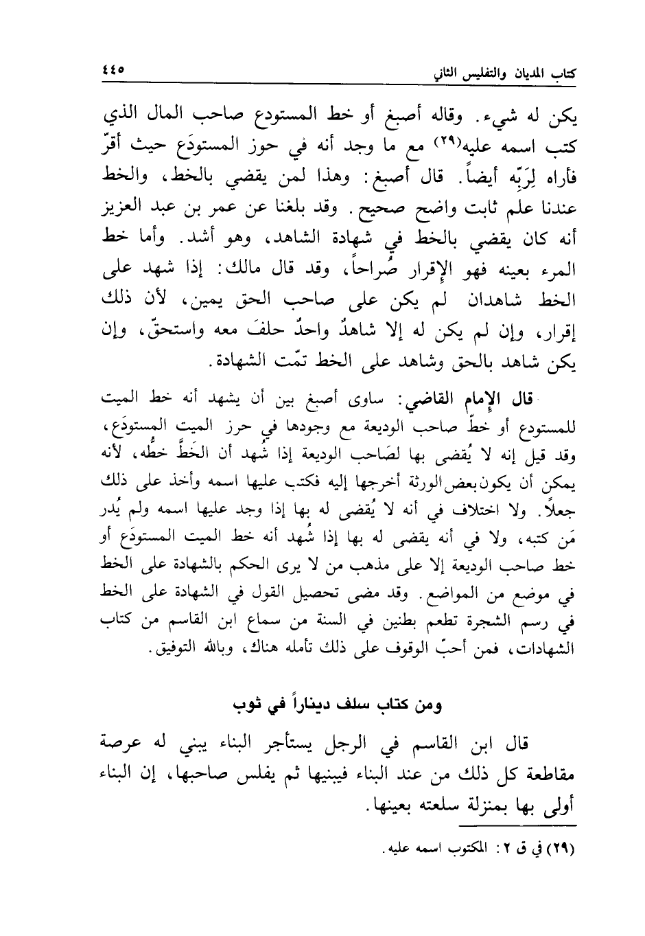 قال أصبغ: وهذا لمن يقضي بالخط، والخط عندنا علم ثابت واضح صحيح. وقد بلغنا عن عمر بن عبد العزيز أنه كان يقضي بالخط في شهادة الشاهد، وهو أشد.