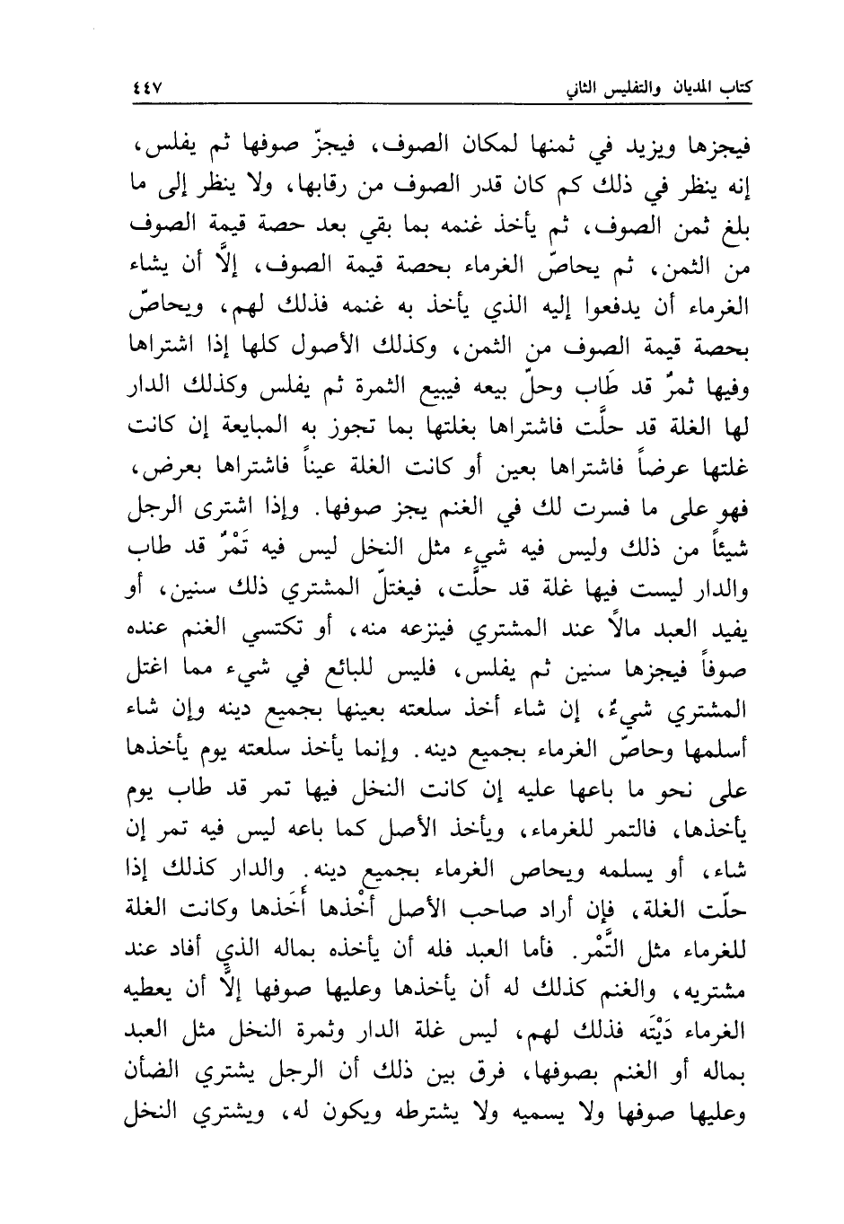 فأما العبد فله أن يأخذه بماله الذي أفاد عند مشتريه، والغنم كذلك له أن يأخذها وعليها صوفها إلا أن يعطيه الغرماء ديته فذلك لهم، ليس غلة الدار وثمرة النخل مثل العبد بماله أو الغنم بصوفها، فرق بين ذلك أن الرجل يشتري الضأن وعليها صوفها ولا يسميه ولا يشترطه ويكون له، ويشتري النخل