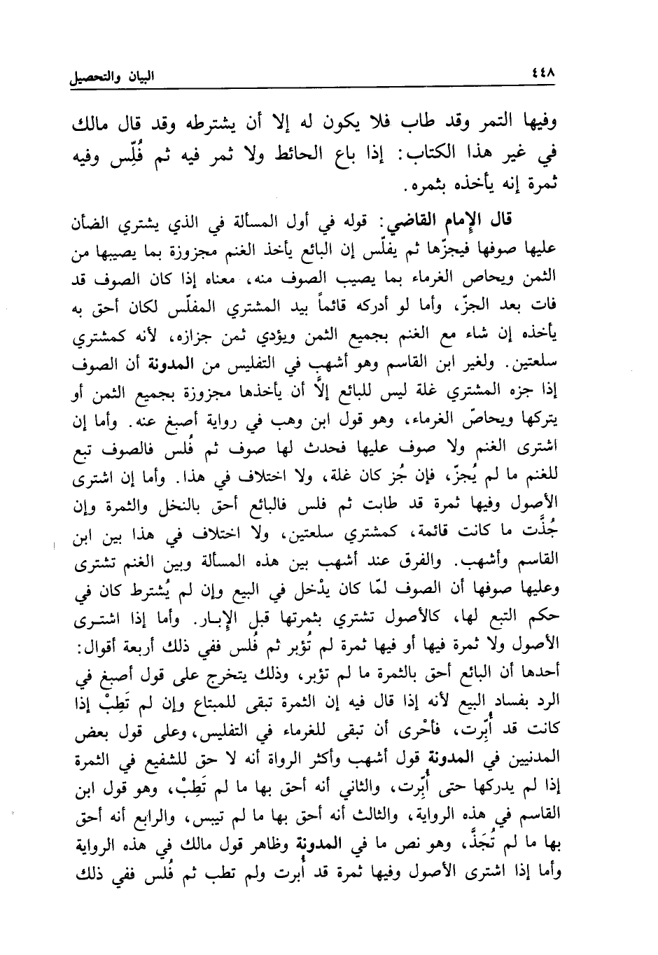ولغير ابن القاسم وهو أشهب في التفليس من المدونة أن الصوف إذا جزه المشتري غلة ليس للبائع إلا أن يأخذها مجزوزة بجميع الثمن أو يتركها ويحاص الغرماء، وهو قول ابن وهب في رواية أصبغ عنه.
