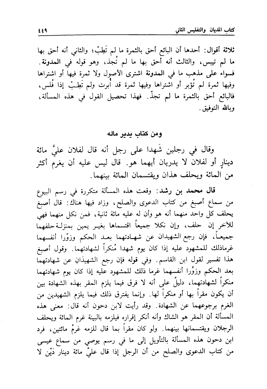 ولو كان مقرا بما قال للزمه غرم مائتين، فرد ابن دحون هذه المسألة بالتأويل إلى ما في رسم يوصي من سماع عيسى من كتاب الدعوى والصلح من أن الرجل إذا قال علي مائة دينار دين لا