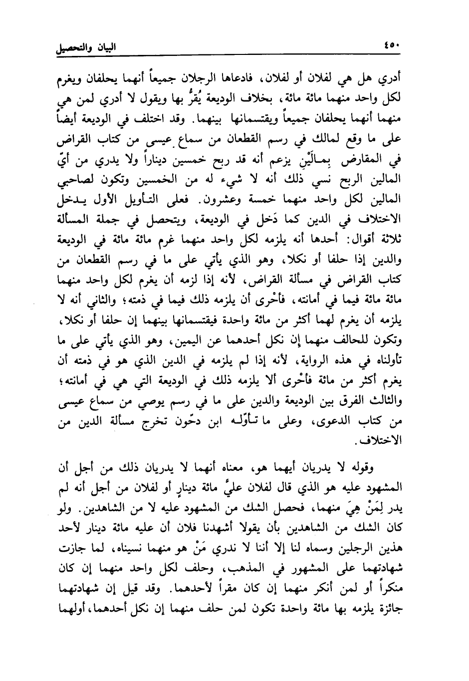 وقد اختلف في الوديعة أيضا على ما وقع لمالك في رسم القطعان من سماع عيسى من كتاب القراض في المقارض بمالين يزعم أنه قد ربح خمسين دينارا ولا يدري من أي المالين الربح نسي ذلك أنه لا شيء له من الخمسين وتكون لصاحبي المالين، لكل واحد منهما خمسة وعشرون.