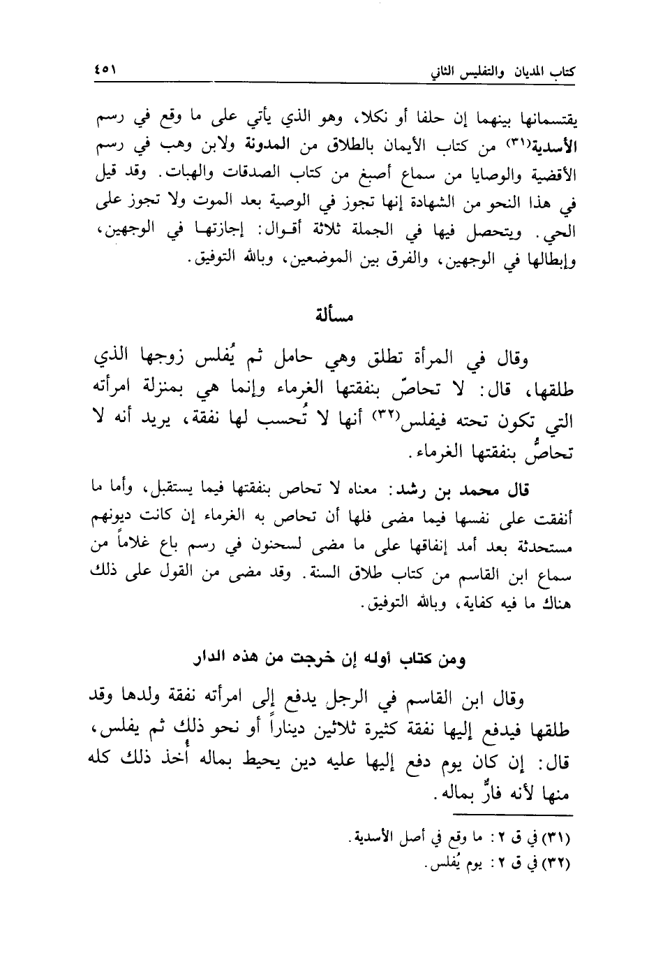 مسألة وقال في المرأة تطلق وهي حامل ثم يفلس زوجها الذي طلقها، قال: لا تحاص بنفقتها الغرماء وإنما هي بمنزلة امرأته التي تكون تحته فيفلس أنها لا تحسب لها نفقة، يريد: أنه لا تحاص بنفقتها الغرماء.