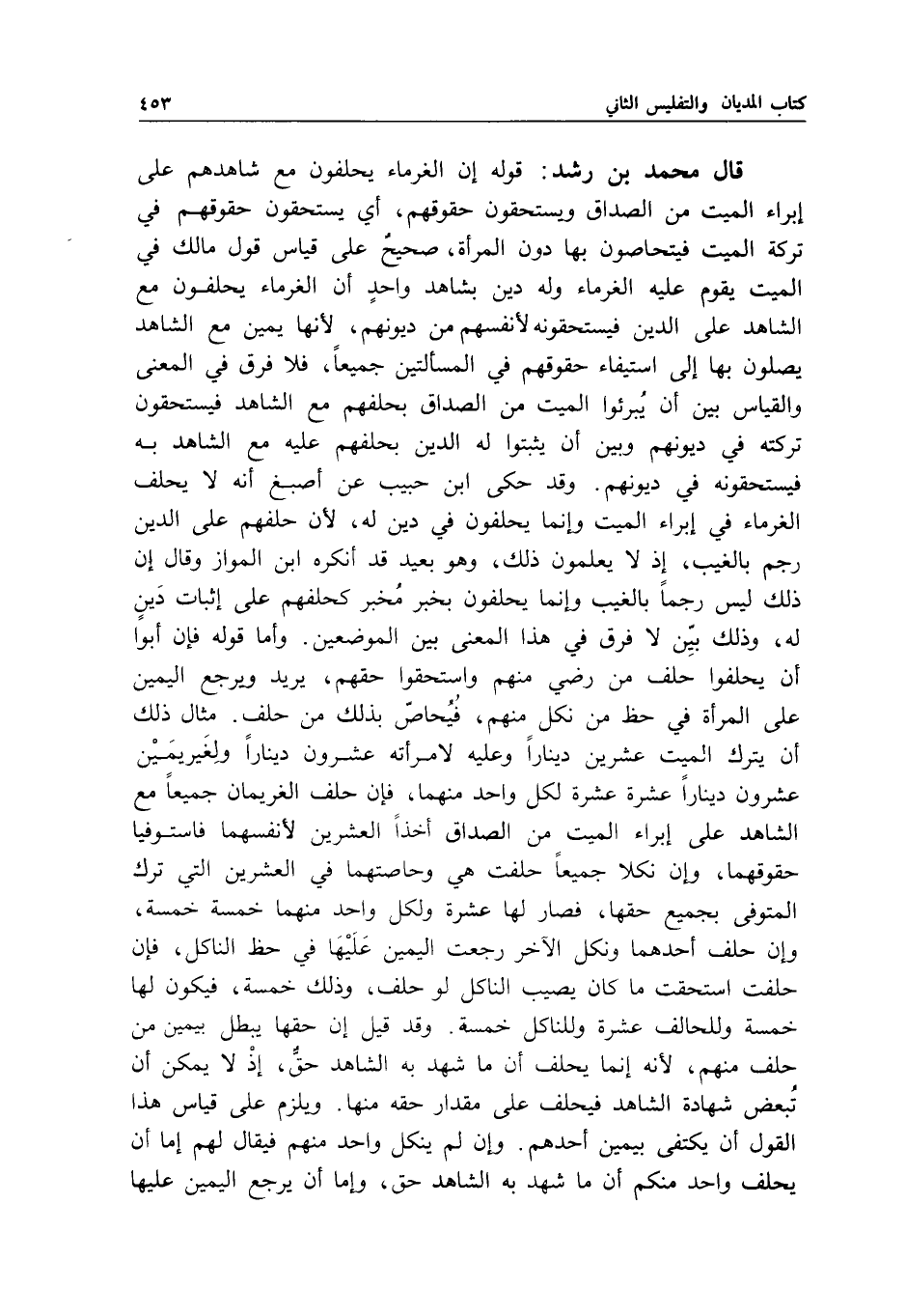 مثال ذلك: أن يترك الميت عشرين دينارا وعليه لامرأته عشرون دينارا، ولغريمين عشرون دينارا، عشرة عشرة لكل واحد منهما، فإن حلف الغريمان جميعا مع الشاهد على إبراء الميت من الصداق أخذا العشرين لأنفسهما فاستوفيا حقوقهما، وإن نكلا جميعا حلفت هي وحاصتهما في العشرين التي ترك المتوفى بجميع حقها، فصار لها عشرة ولكل واحد منهما خمسة خمسة، وإن حلف أحدهما ونكل الآخر رجعت اليمين عليها في حظ الناكل، فإن حلفت استحقت ما كان يصيب الناكل لو حلف، وذلك خمسة، فيكون لها خمسة وللحالف عشرة وللناكل خمسة.