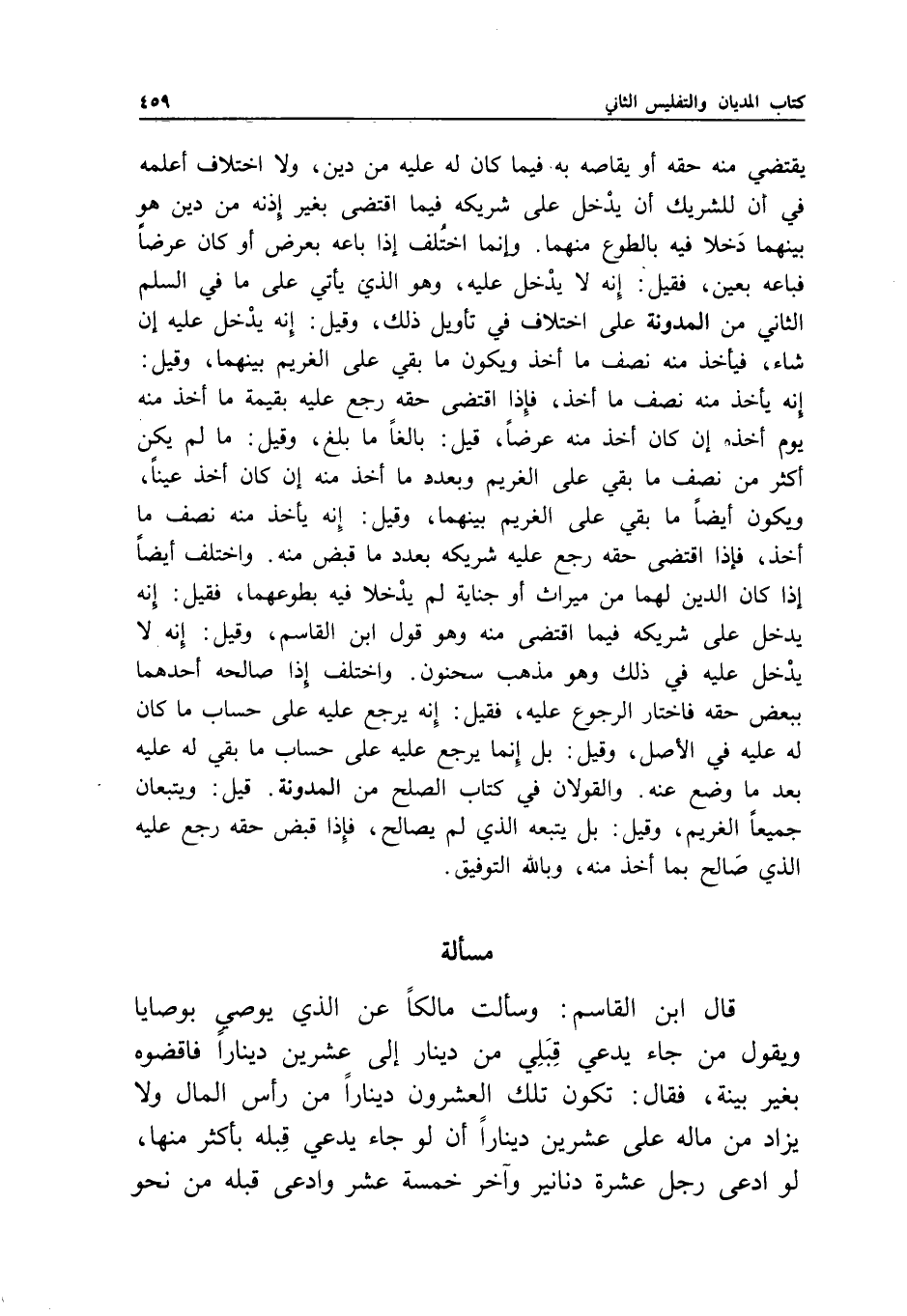 واختلف أيضا إذا كان الدين لهما من ميراث أو جناية لم يدخلا فيه بطوعهما، فقيل: إنه يدخل على شريكه فيما اقتضى منه، وهو قول ابن القاسم، وقيل: إنه لا يدخل عليه في ذلك وهو مذهب سحنون.