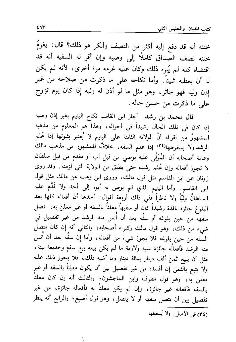 قال محمد بن رشد: أجاز ابن القاسم نكاح اليتيم بغير إذن وصيه إذا كان في تلك الحال رشيدا في أحواله، وهذا هو المعلوم من مذهبه المشهور من أقواله أن الولاية الثابتة على اليتيم لا يعتبر بثبوتها إذا علم الرشد ولا بسقوطها إذا علم السفه، خلاف للمشهور من مذهب مالك وعامة أصحابه أن المولى عليه بوصي من قبل أب أو مقدم من قبل سلطان لا تجوز أفعاله وإن علم رشده حتى يطلق من الولاية التي لزمته.