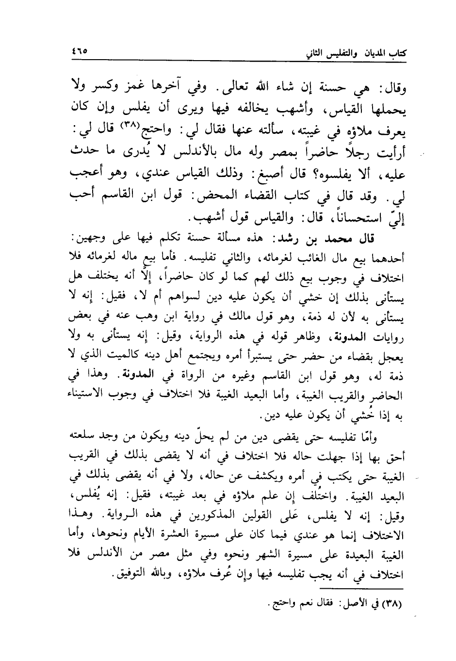 وفي آخرها غمز وكسر ولا يحملها القياس، وأشهب يخالفه فيها ويرى أن يفلس وإن كان يعرف ملاؤه في غيبته، سألته عنها فقال لي: واحتج، قال لي: أرأيت رجلا حاضرا بمصر وله مال بالأندلس لا يدرى ما حدث عليه، ألا يفلسوه؟