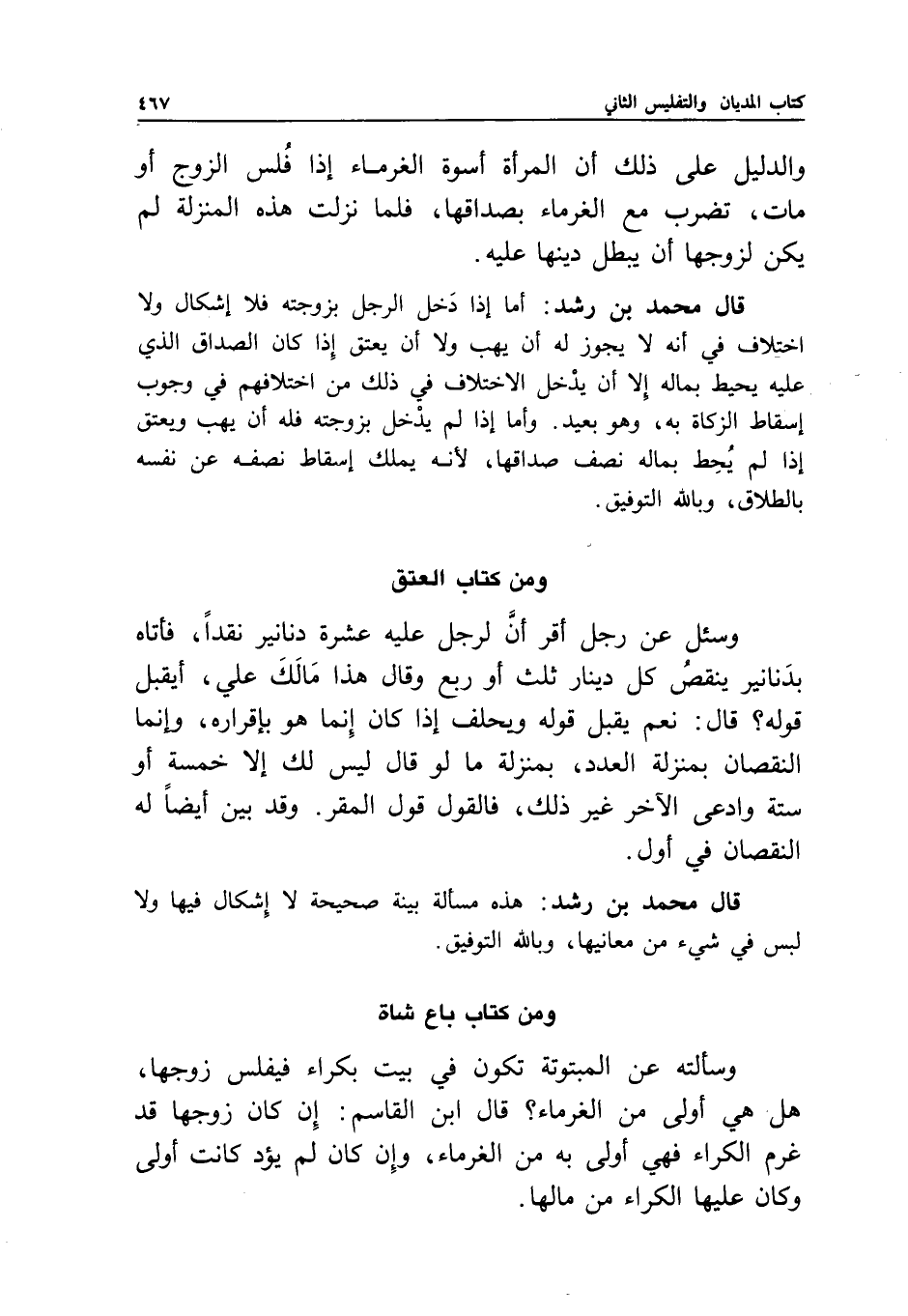 قال محمد بن رشد: هذه مسألة بينة صحيحة لا إشكال فيها ولا لبس في شيء من معانيها، وبالله التوفيق.