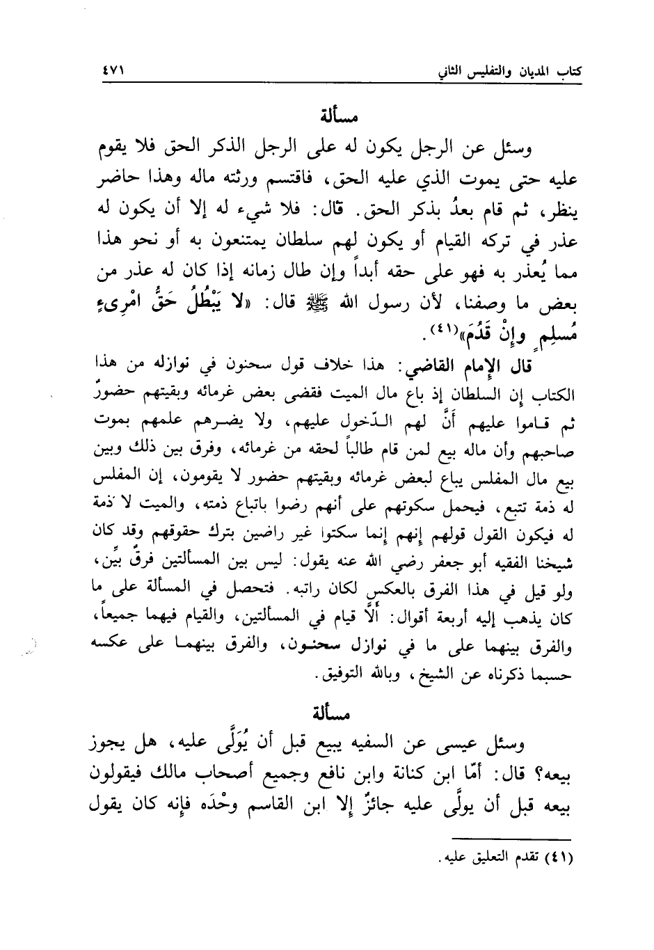 قال الإمام القاضي: هذا خلاف قول سحنون في نوازله من هذا الكتاب: إن السلطان إذ باع مال الميت فقضى بعض غرمائه وبقيتهم حضور ثم قاموا عليهم أن لهم الدخول عليهم، ولا يضرهم علمهم بموت صاحبهم وأن ماله بيع لمن قام طالبا لحقه من غرمائه، وفرق بين ذلك وبين بيع مال المفلس يباع لبعض غرمائه وبقيتهم حضور لا يقومون، إن المفلس له ذمة تتبع، فيحمل سكوتهم على أنهم رضوا باتباع ذمته، والميت لا ذمة له فيكون القول قولهم إنهم إنما سكتوا غير راضين بترك حقوقهم، وقد كان شيخنا الفقيه أبو جعفر - رَضِيَ اللَّهُ عَنْهُ - يقول: ليس بين المسألتين فرق بين، ولو قيل في هذا الفرق بالعكس لكان راتبه.
