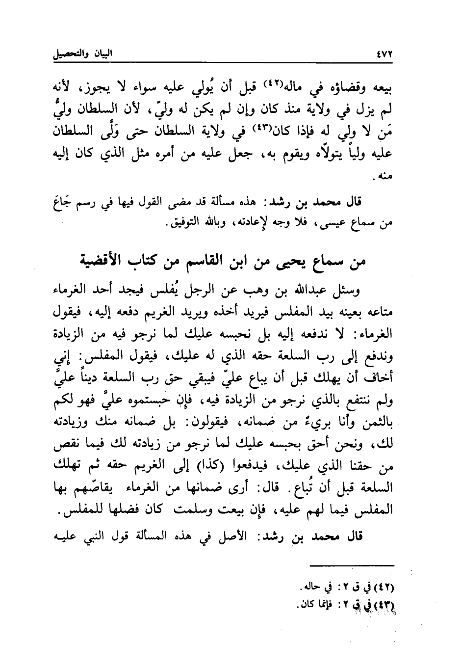 من سماع يحيى من ابن القاسم من كتاب الأقضية وسئل عبد الله بن وهب: عن الرجل يفلس فيجد أحد الغرماء متاعه بعينه بيد المفلس فيريد أخذه ويريد الغريم دفعه إليه، فيقول الغرماء: لا ندفعه إليه بل نحبسه عليك لما نرجو فيه من الزيادة وندفع إلى رب السلعة حقه الذي له عليك، فيقول المفلس: إني أخاف أن يهلك قبل أن يباع علي فيبقى حق رب السلعة دينا علي ولم ننتفع بالذي نرجو من الزيادة فيه، فإن حبستموه علي فهو لكم بالثمن وأنا بريء من ضمانه، فيقولون: بل ضمانه منك وزيادته لك، ونحن أحق بحبسه عليك لما نرجو من زيادته لك فيما نقص من حقنا الذي عليك، فيدفعوا (كذا) إلى الغريم حقه ثم تهلك السلعة قبل أن تباع.