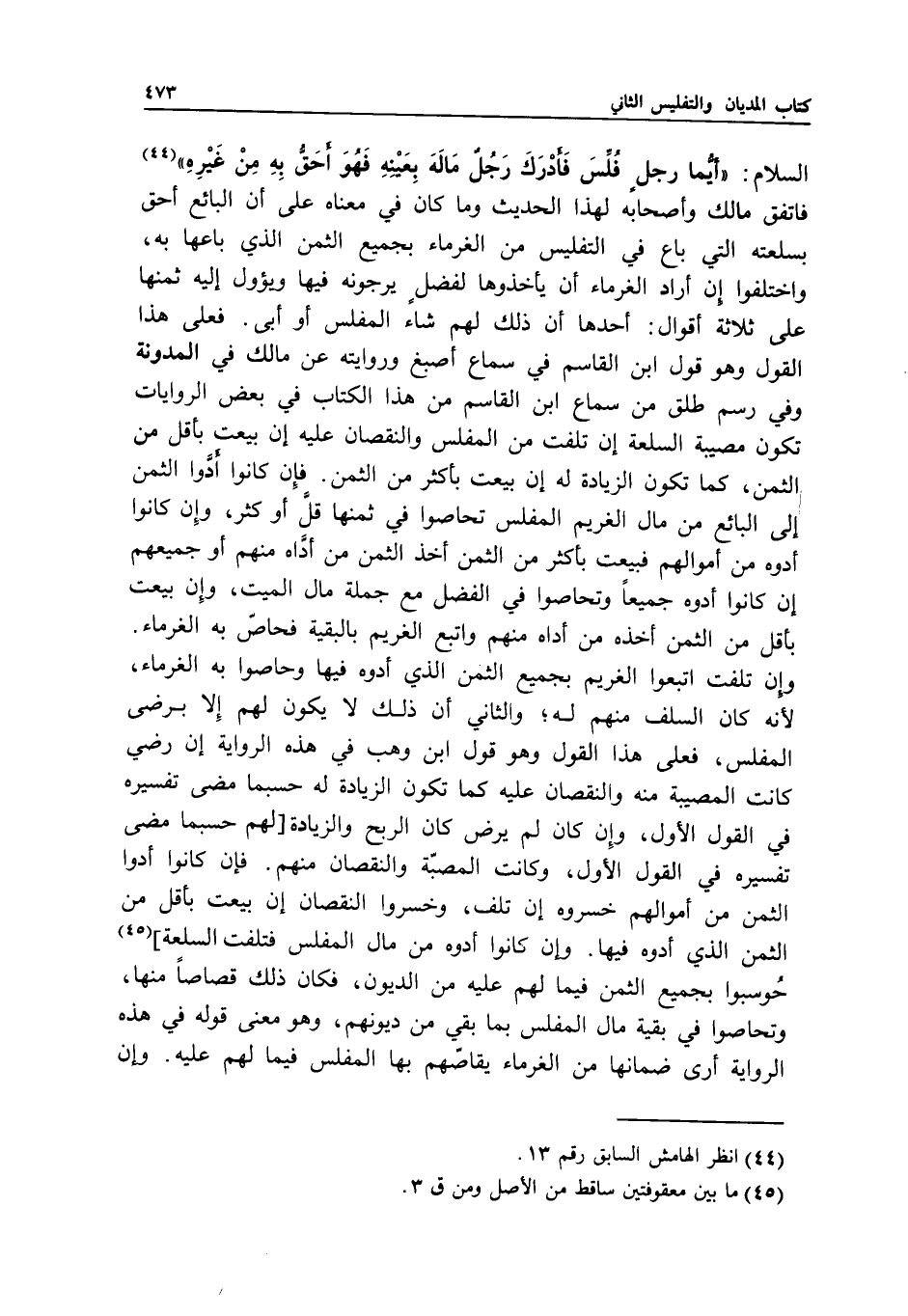 السلام: «أيما رجل فلس فأدرك رجل ماله بعينه فهو أحق به من غيره» فاتفق مالك وأصحابه لهذا الحديث وما كان في معناه: على أن البائع أحق بسلعته التي باع في التفليس من الغرماء بجميع الثمن الذي باعها به، واختلفوا إن أراد الغرماء أن يأخذوها لفضل يرجونه فيها ويئول إليه ثمنها على ثلاثة أقوال: