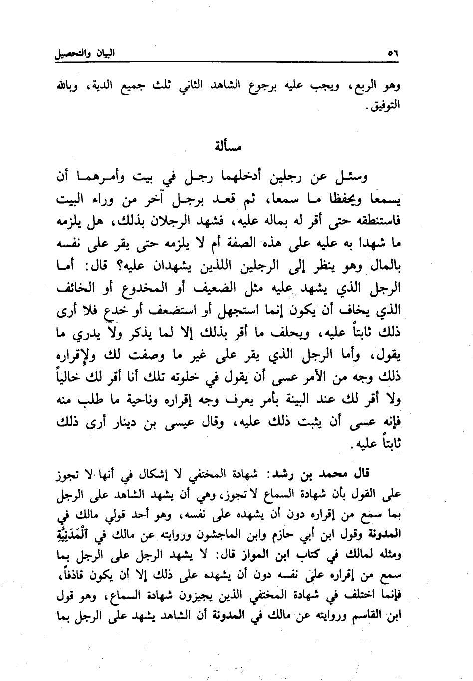قال محمد بن رشد: لا إشكال في أنها لا تجوز على القول بأن شهادة السماع لا تجوز، وهي أن يشهد الشاهد على الرجل بما سمع من إقراره دون أن يشهده على نفسه، وهو أحد قول مالك في المدونة وقول ابن أبي حازم وابن الماجشون وروايته عن مالك في المدنية ومثله لمالك في كتاب ابن المواز قال: لا يشهد الرجل على الرجل بما سمع من إقراره على نفسه دون أن يشهده على ذلك إلا أن يكون قاذفا، فإنما اختلف في شهادة المختفي الذين يجيزون شهادة السماع، وهو قول ابن القاسم وروايته عن مالك في المدونة أن الشاهد يشهد على الرجل بما