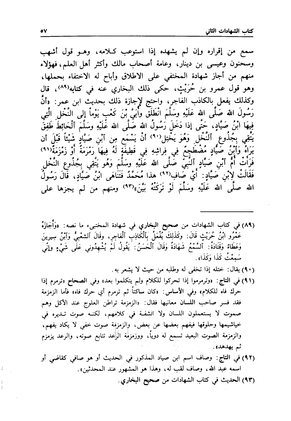 سمع من إقراره وإن لم يشهده إذا استوعب كلامه، وهو قول أشهب وسحنون وعيسى بن دينار، وعامة أصحاب مالك وأكثر أهل العلم، فهؤلاء منهم من أجاز شهادة المختفي على الإطلاق وأباح له الاختفاء بحملها، وهو قول عمرو بن حريث، حكى ذلك البخاري عنه في كتابه، قال: وكذلك يفعل بالكاذب الفاجر، واحتج لإجازة ذلك بحديث ابن عمر: «أن رسول الله - صَلَّى اللَّهُ عَلَيْهِ وَسَلَّمَ - انطلق وأبي بن كعب يوما إلى النخل التي فيها ابن صياد، حتى إذا دخل رسول الله - صَلَّى اللَّهُ عَلَيْهِ وَسَلَّمَ - الحائط طفق يتقي بجذوع النخل وهو يختل أن يسمع من ابن صياد شيئا قبل أن يراه وابن صياد مضطجع في فراشه في قطيفة له فيها رمرمة أو زمزمة فرأت أم ابن صياد النبي - صَلَّى اللَّهُ عَلَيْهِ وَسَلَّمَ - وهو يتقي بجذوع النخل فقالت لابن صياد: أي صاف هذا محمد فتناهى ابن صياد، قال رسول الله - صَلَّى اللَّهُ عَلَيْهِ وَسَلَّمَ -: لو تركته بين» ومنهم من لم يجزها على
