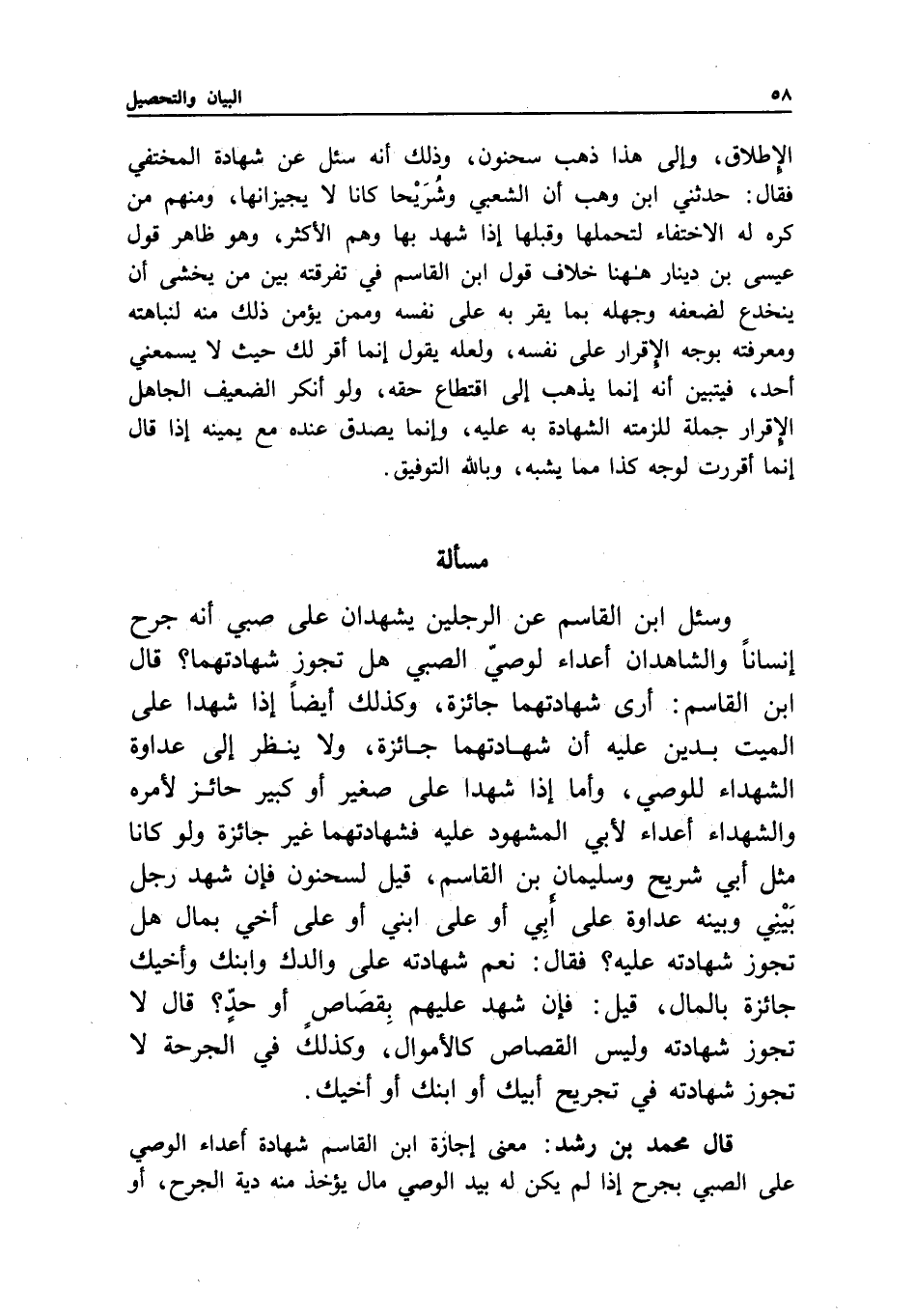 مسألة وسئل ابن القاسم: عن الرجلين يشهدان على صبي أنه جرح إنسانا والشاهدان أعداء لوصي الصبي هل تجوز شهادتهما؟ قال ابن القاسم: أرى شهادتهما جائزة، وكذلك أيضا إذا شهدا على الميت بدين عليه أن شهادتهما جائزة، ولا ينظر إلى عداوة الشهداء للوصي، وأما إذا شهدا على صغير أو كبير حائز لأمره والشهداء أعداء لأبي المشهود عليه فشهادتهما غير جائزة ولو كانا مثل أبي شريح وسليمان بن القاسم، قيل لسحنون: فإن شهد رجل بيني وبينه عداوة على أبي أو على ابني أو على أخي بمال هل تجوز شهادته عليه؟ فقال: نعم شهادته على والدك وابنك وأخيك جائزة بالمال، قيل: فإن شهد عليهم بقصاص أو حد؟ قال: لا تجوز شهادته وليس القصاص كالأموال، وكذلك في الجرحة لا تجوز شهادته في تجريح أبيك أو ابنك أو أخيك.