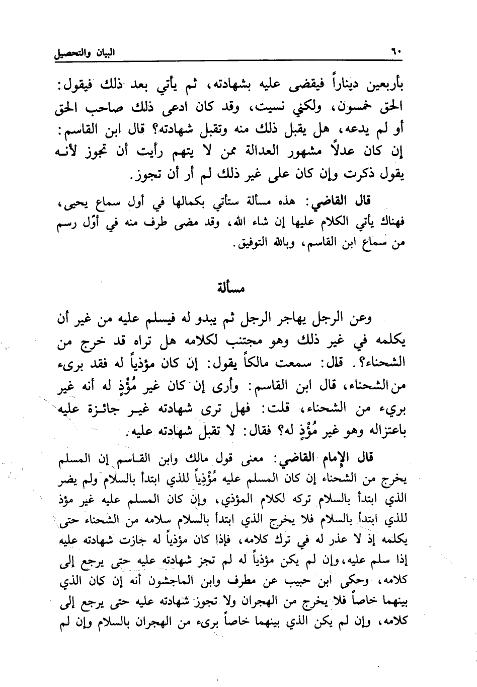 قال الإمام القاضي: معنى قول مالك وابن القاسم: إن المسلم يخرج من الشحناء إن كان المسلم عليه مؤذيا للذي ابتدأ بالسلام ولم يضر الذي ابتدأ بالسلام تركه لكلام المؤذي، وإن كان المسلم عليه غير مؤذ للذي ابتدأ بالسلام فلا يخرج الذي ابتدأ بالسلام سلامه من الشحناء حتى يكلمه إذ لا عذر له في ترك كلامه، فإذا كان مؤذيا له جازت شهادته عليه إذا سلم عليه، وإن لم يكن مؤذيا له لم تجز شهادته عليه حتى يرجع إلى كلامه، وحكى ابن حبيب عن مطرف وابن الماجشون أنه إن كان الذي بينهما خاصا فلا يخرج من الهجران ولا تجوز شهادته عليه حتى يرجع إلى كلامه، وإن لم يكن الذي بينهما خاصا برئ من الهجران بالسلام وإن لم