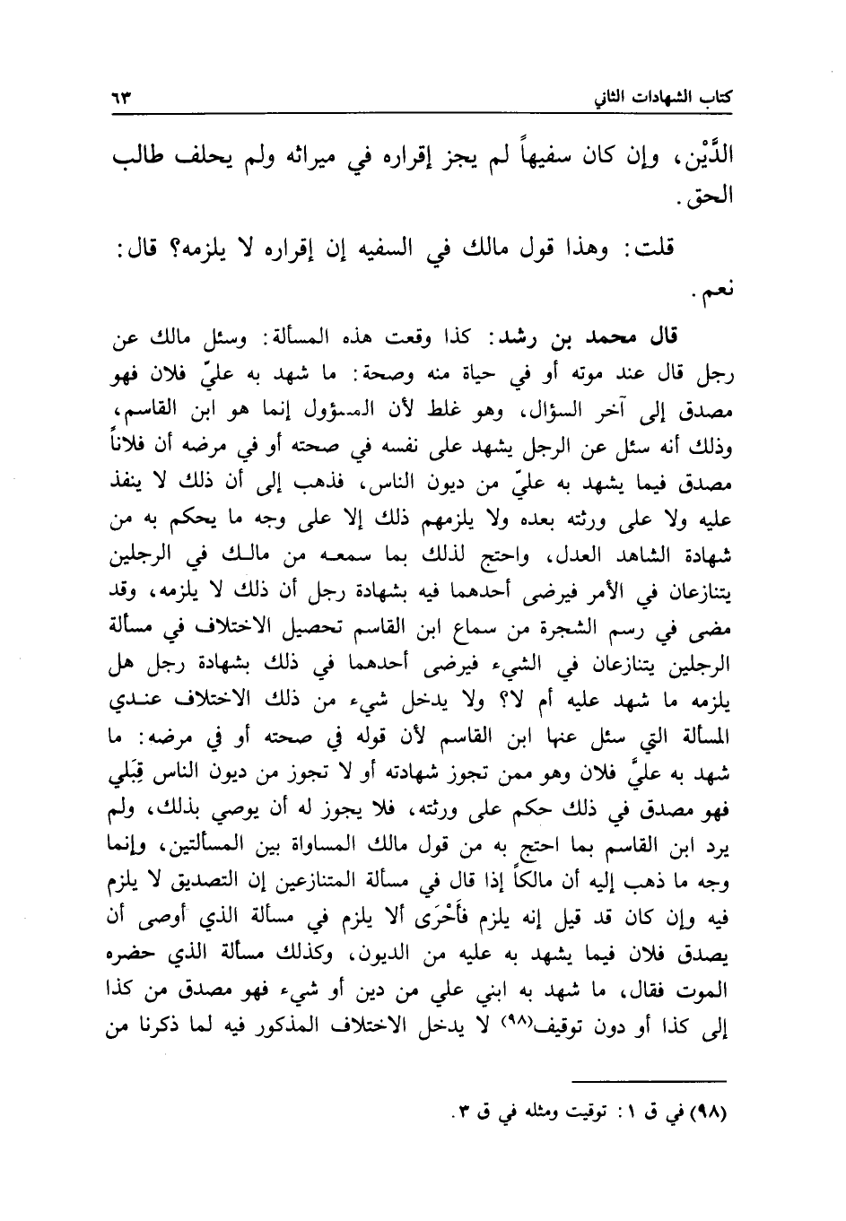 قال محمد بن رشد: كذا وقعت هذه المسألة: وسئل مالك عن رجل قال عند موته أو في حياة منه وصحة: ما شهد به علي فلان فهو مصدق إلى آخر السؤال، وهو غلط؛ لأن المسئول إنما هو ابن القاسم، وذلك أنه سئل عن الرجل يشهد على نفسه في صحته أو في مرضه أن فلانا مصدق فيما يشهد به علي من ديون الناس، فذهب إلى أن ذلك لا ينفذ عليه ولا على ورثته بعده ولا يلزمهم ذلك إلا على وجه ما يحكم به من شهادة الشاهد العدل، واحتج لذلك بما سمعه من مالك في الرجلين يتنازعان في الأمر فيرضى أحدهما فيه بشهادة رجل أن ذلك لا يلزمه، وقد مضى في رسم الشجرة من سماع ابن القاسم تحصيل الاختلاف في مسألة الرجلين يتنازعان في الشيء فيرضى أحدهما في ذلك بشهادة رجل هل يلزمه ما شهد عليه أم لا؟ ولا يدخل شيء من ذلك الاختلاف عندي المسألة التي سئل عنها ابن القاسم؛ لأن قوله في صحته أو في مرضه: ما شهد به علي فلان وهو ممن تجوز شهادته أو لا تجوز من ديون الناس قبلي فهو مصدق في ذلك حكم على ورثته، فلا يجوز له أن يوصي بذلك، ولم يرد ابن القاسم بما احتج به من قول مالك المساواة بين المسألتين، وإنما وجه ما ذهب إليه أن مالكا إذا قال في مسألة المتنازعين إن التصديق لا يلزم فيه وإن كان قد قيل: إنه يلزم فأحرى ألا يلزم في مسألة الذي أوصى أن يصدق فلان فيما يشهد به عليه من الديون، وكذلك مسألة الذي حضره الموت فقال، ما شهد به ابني علي من دين أو شيء فهو مصدق من كذا إلى كذا أو دون توقيف لا يدخل الاختلاف المذكور فيه لما ذكرنا من