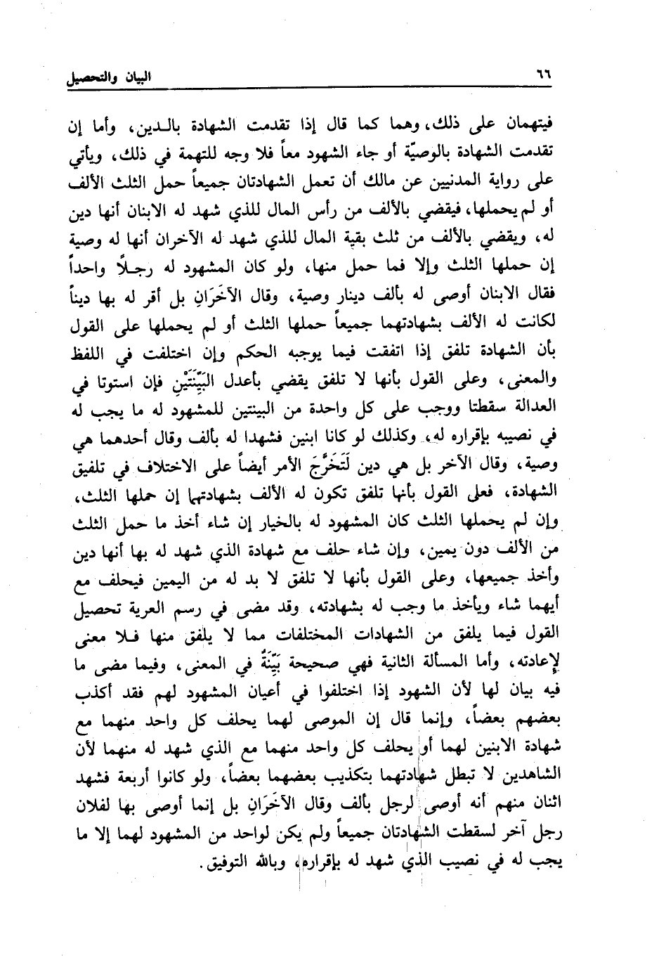 فيتهمان على ذلك، وهما كما قال إذا تقدمت الشهادة بالدين، وأما إن تقدمت الشهادة بالوصية أو جاء الشهود معا فلا وجه للتهمة في ذلك، ويأتي على رواية المدنيين عن مالك أن تعمل الشهادتان جميعا حمل الثلث الألف أو لم يحملها، فيقضي بالألف من رأس المال للذي شهد له الابنان أنها دين له، ويقضي بالألف من ثلث بقية المال للذي شهد له الآخران أنها له وصية إن حملها الثلث وإلا فما حمل منها، ولو كان المشهود له رجلا واحدا فقال الابنان: أوصى له بألف دينار وصية، وقال الآخران: بل أقر له بها دينا لكانت له الألف بشهادتهما جميعا حملها الثلث أو لم يحملها على القول بأن الشهادة تلفق إذا اتفقت فيما يوجبه الحكم وإن اختلفت في اللفظ والمعنى، وعلى القول بأنها لا تلفق يقضي بأعدل البينتين فإن استوتا في العدالة سقطتا ووجب على كل واحدة من البينتين للمشهود له ما يجب له في نصيبه بإقراره له، وكذلك لو كانا ابنين فشهدا له بألف، وقال أحدهما: هي وصية، وقال الآخر: بل هي دين لتخرج الأمر أيضا على الاختلاف في تلفيق الشهادة، فعلى القول بأنها تلفق تكون له الآلف بشهادتهما إن حملها الثلث، وإن لم يحملها الثلث كان المشهود له بالخيار إن شاء أخذ ما حمل الثلث من الألف دون يمين، وإن شاء حلف مع شهادة الذي شهد له بها أنها دين وأخذ جميعها، وعلى القول بأنها لا تلفق لا بد له من اليمين فيحلف مع أيهما شاء ويأخذ ما وجب له بشهادته، وقد مضى في رسم العرية تحصيل القول فيما يلفق من الشهادات المختلفات مما لا يلفق منها فلا معنى لإعادته، وأما المسألة الثانية فهي صحيحة بينة في المعنى، وفيما مضى ما فيه بيان لها؛ لأن الشهود إذا اختلفوا في أعيان المشهود لهم فقد أكذب بعضهم بعضا، وإنما قال: إن الموصى لهما يحلف كل واحد منهما مع شهادة الابنين لهما أو يحلف كل واحد منهما مع الذي شهد له منهما؛ لأن الشاهدين لا تبطل شهادتهما بتكذيب بعضهما بعضا، ولو كانوا أربعة فشهد اثنان منهم أنه أوصى لرجل بألف، وقال الآخران: بل إنما أوصى بها لفلان رجل آخر لسقطت الشهادتان جميعا ولم يكن لواحد من المشهود لهما إلا ما يجب له في نصيب الذي شهد له بإقراره، وبالله التوفيق.